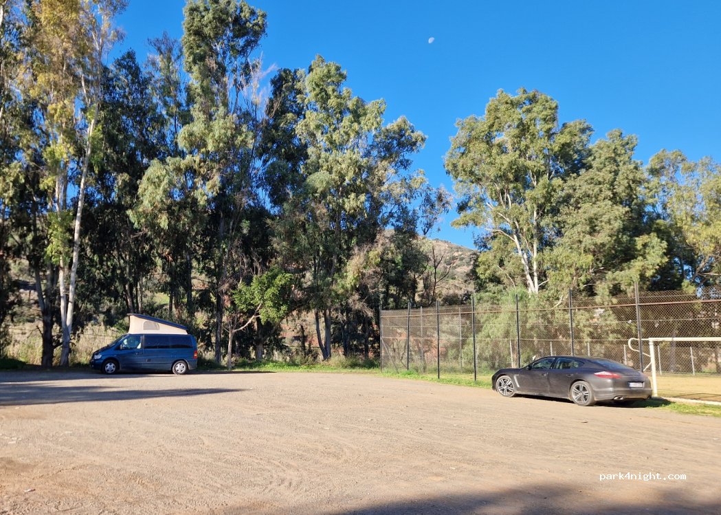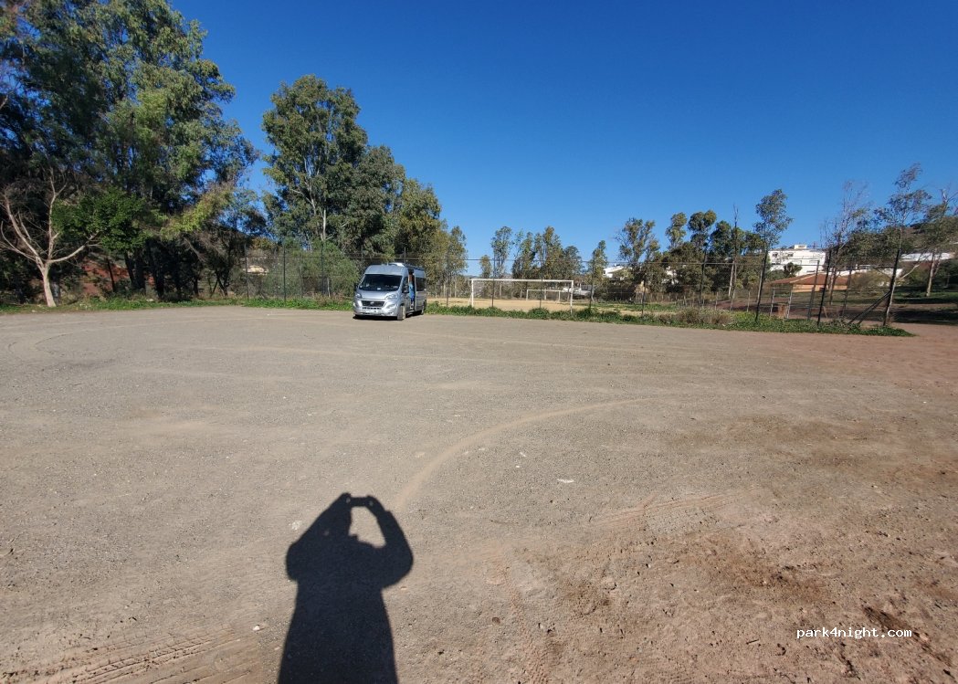 Zona llana y accesible junto a un campo de fútbol vallado. Restaurantes cercanos. Tranquilo.