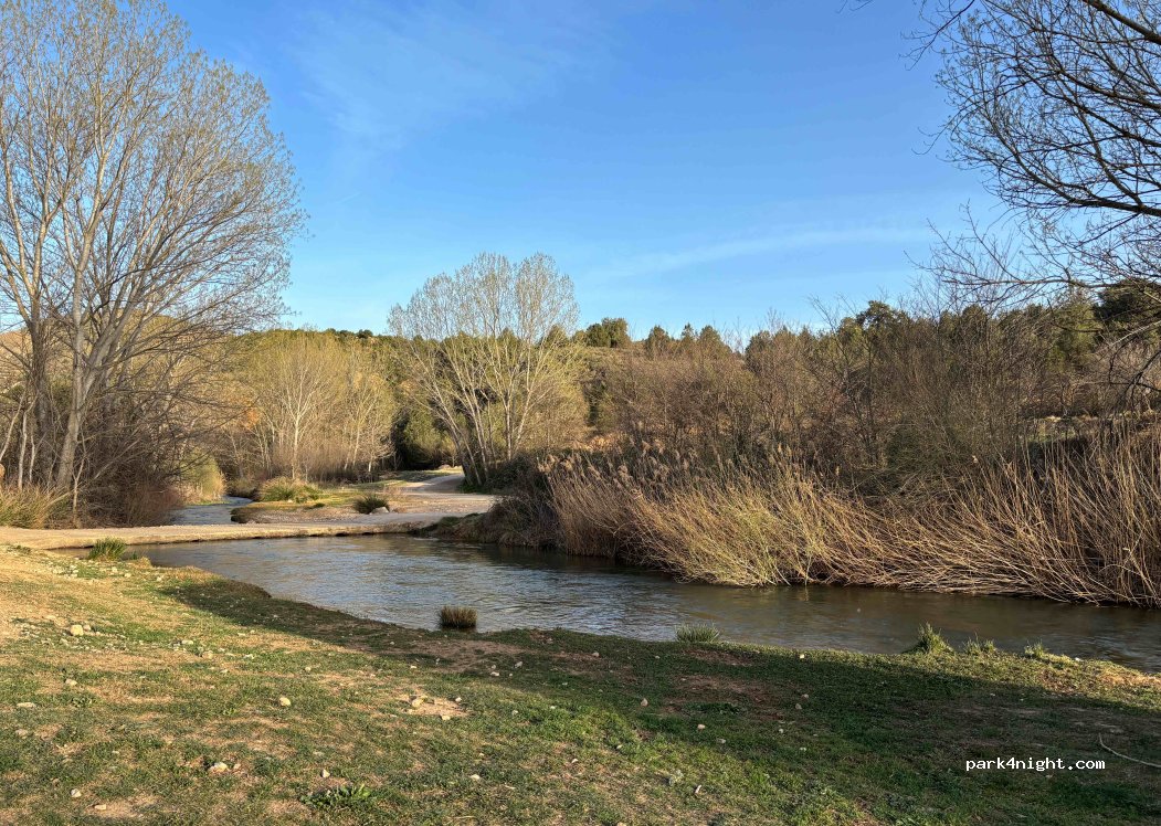 Petite prairie au bord de la rivière, ombragée. Visite idéale du gouffre voisin et de la ville ibérique. Convient aux autocaravanes, environ trois.