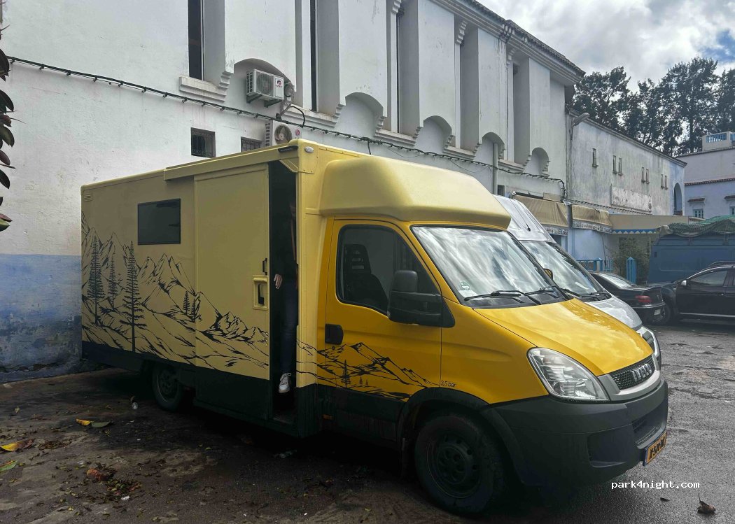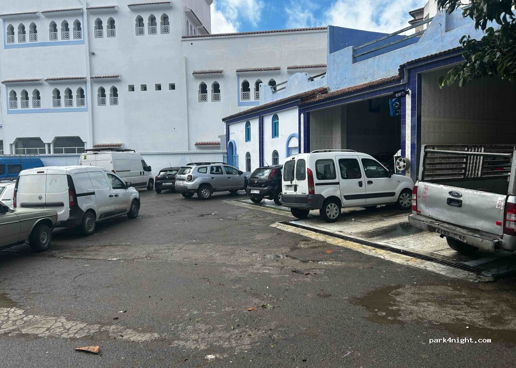 Clean parking lot where you can stay overnight. Paid, ask at the entrance for availability. Car wash in the corner, you can ask for water and pay for it. Near the medina, 5 minutes walk. Bakery and pastry shop 3 minutes walk on the left.