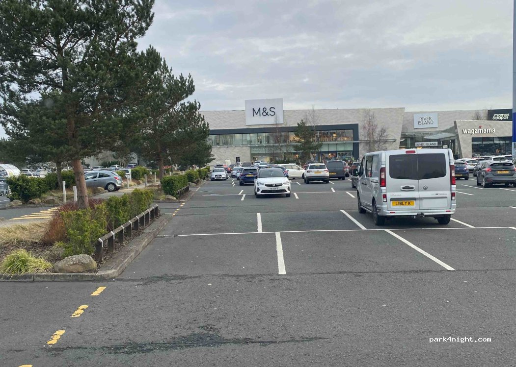 Parking lot of the Glasgow Park shopping center. Many shops. Large parking lot with many spaces to fit any sized vehicle. No time limit, no prohibition signs. LPG pump at the morrisons petrol station in the complex.