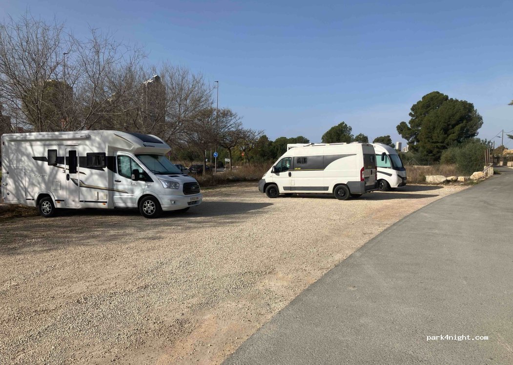 Wij zijn hier twee keer twee nachten geweest en als je achter het gebouw parkeert is het rustiger. Doordeweeks en dan alleen overdag staan er wel auto’s geparkeerd, maar die ga in de loop van de middag weg en dan is het erg rustig. Veel vuilnis, maar een goede plek voor een bezoek aan Benidorm. Je kan hier ook de honden redelijk uitlaten.