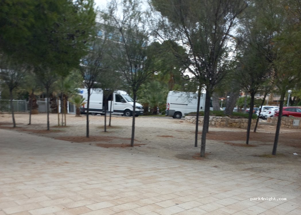 We slept here for one night in the end of november. 4 motorhomes there. Only works in low season when the hotels are closed. Quiet, felt safe , the police went by with their car in the evening.
