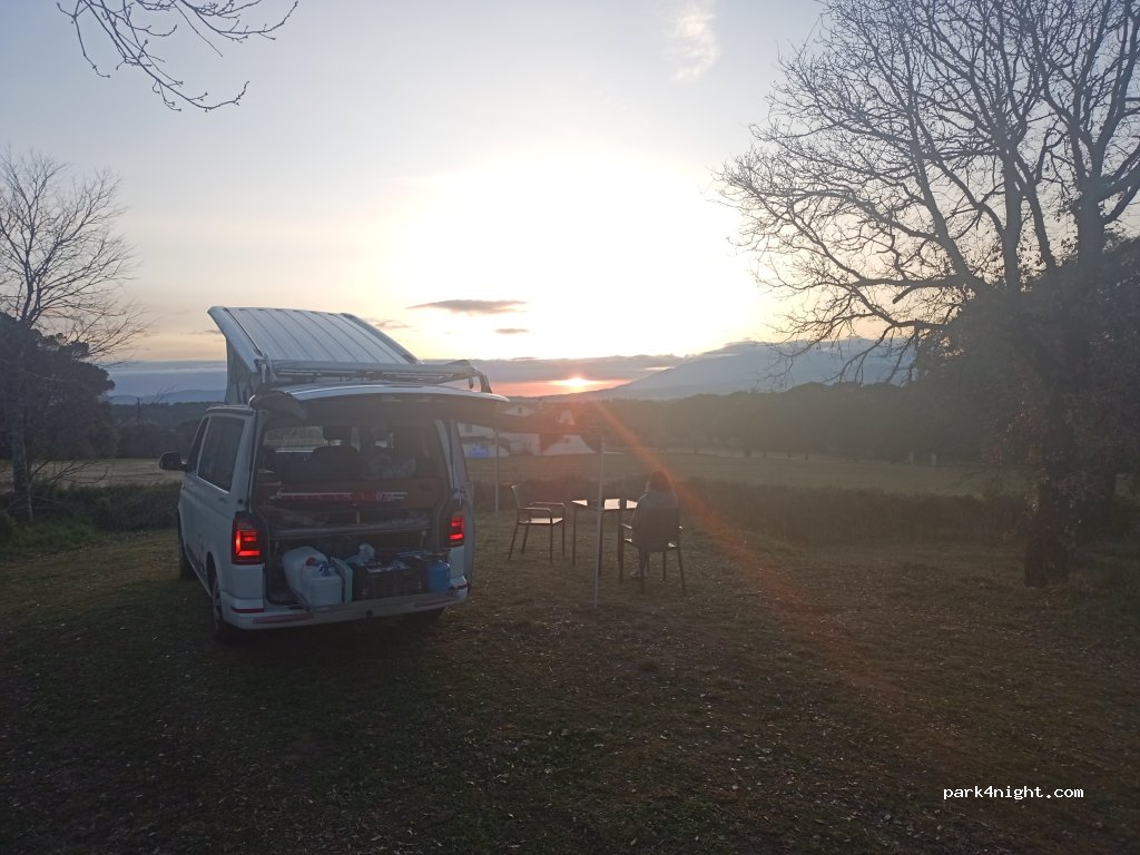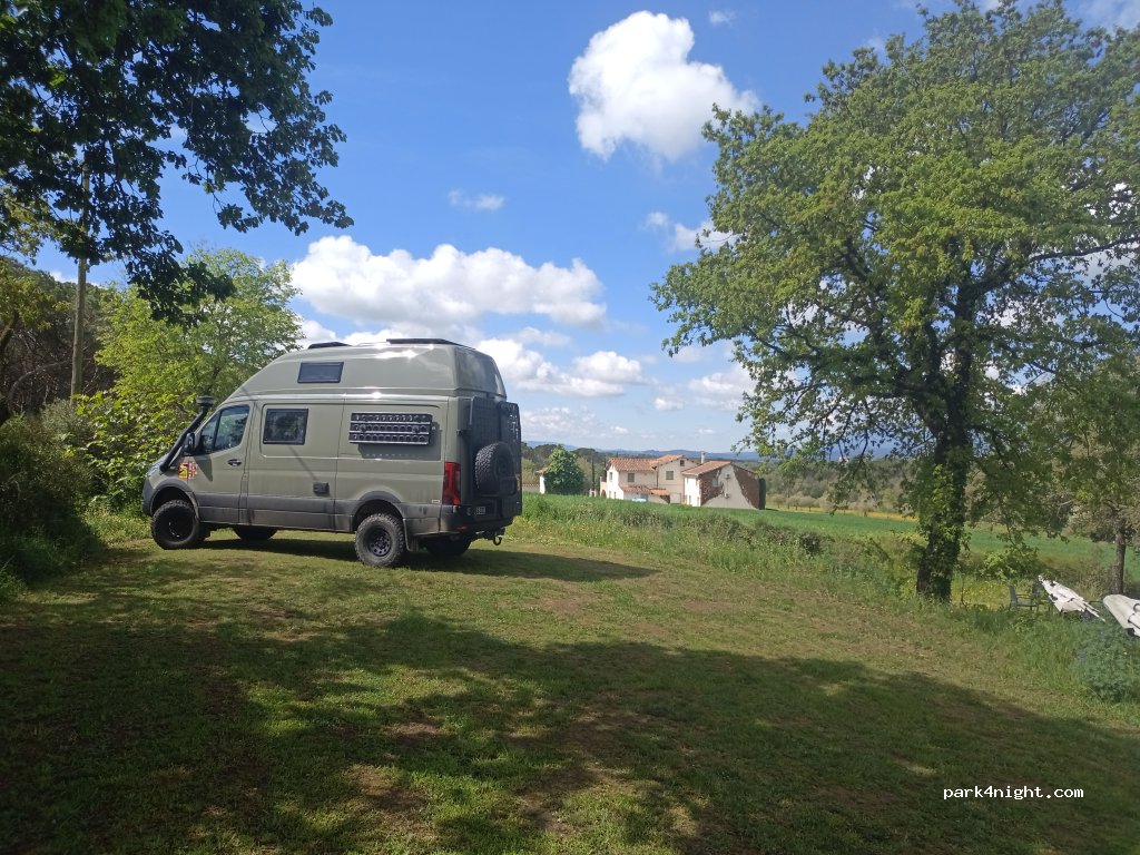 Aire de camping-car privée en pleine nature. Accès privé et vidéosurveillance. Veuillez nous contacter par téléphone. Nous disposons d'eau de source potable et d'électricité gratuites (*), ainsi que de toilettes sèches et d'une douche froide ! :)