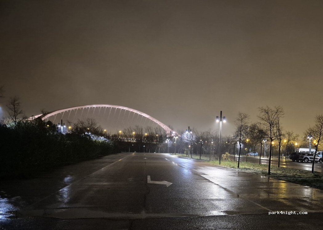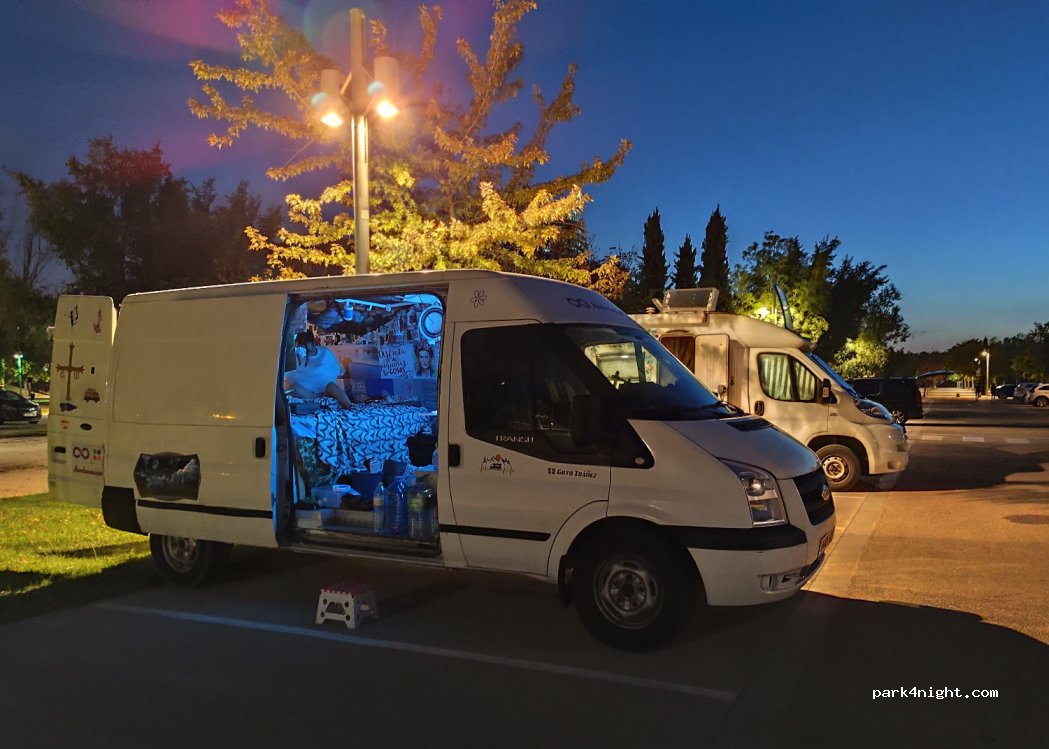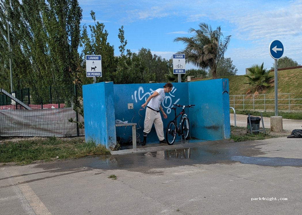 Surprisingly extremely quiet night here. Huge parking. No overnight Fiestas or dangerous roadshows. Only runners and dog-walkers. In the corner, there is a hose to clean dogs and bikes. I believe you could refill your water tank if needed. Also plenty of trash bins. 15 minutes by bike until center town. There is an easy cycle path.