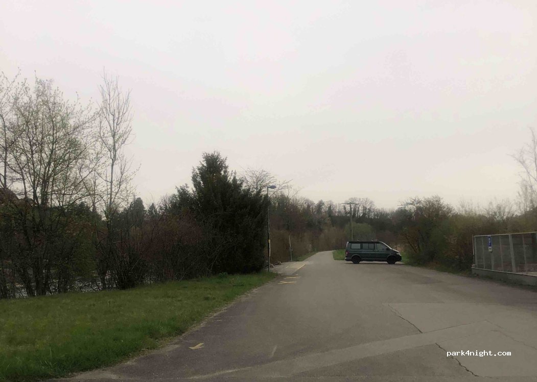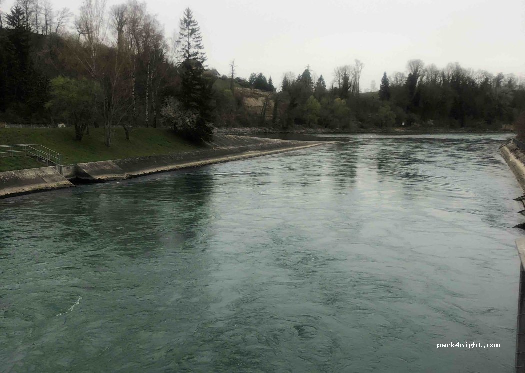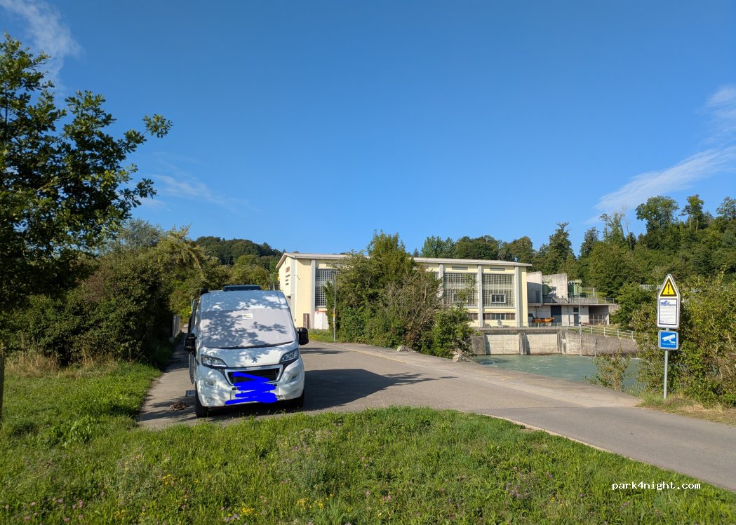 Der Parkplatz liegt hinter dem Kraftwerk, an der Verbindungsstrasse Richtung Ostermaningen. Es hat ab und zu Autos die vorbei fahren oder parkieren. Ansonsten nur das Rauschen der Aare zu hören.