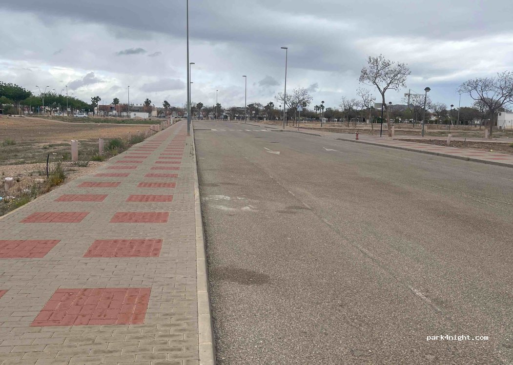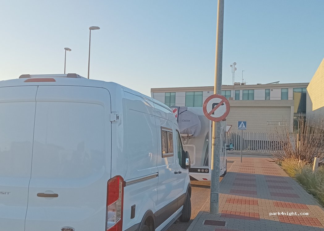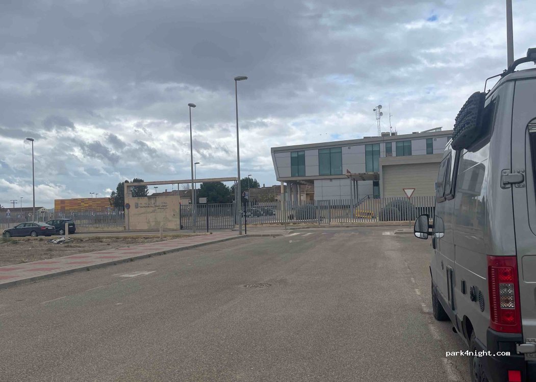 In front of the local police station, without services, flat, quiet and safe. Perfect place to spend the night if you visit Cabeza Gordo the next day.
