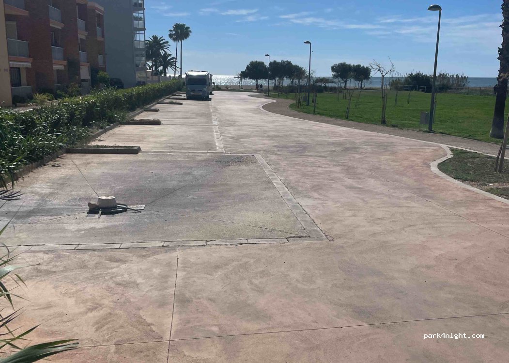Place de parking gratuite en journée uniquement avec 7 emplacements directement sur la plage. Ne pas dormir ! Supermarché à 50m. Surfaces droites. par contre c'est une aire où vous pouvez vidanger eau grise eaux noir même si les voisins ne le tolèrent pas