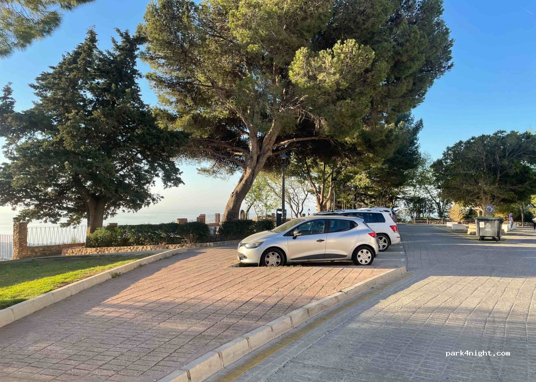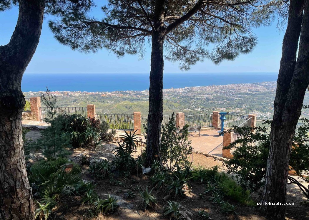 Petit parking devant la place de Toros et l’église (qu’on entend bien). Vue sur le parc des murailles et la côte à perte de vue! Magnifique. Wc publics le long des arènes. Calme et super ambiance. Super parc pour enfants. À 3mn du centre de Mijas sur les hauteurs (rue étroite pour y arriver, peut être pas pour les gros camping car mais en van pas de souci).