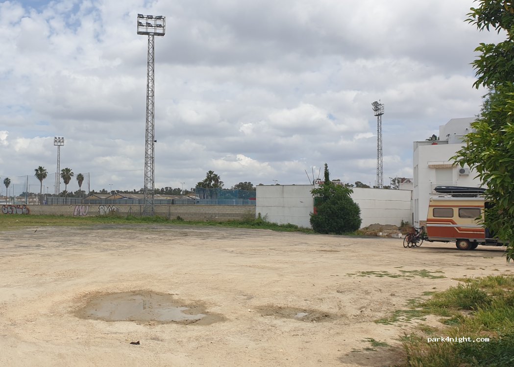 Great place to spend the day (or even the night) near the motorhome area of the port in case it is full and you have to wait a while. The entrance is a bit narrow, it may not be suitable for large vehicles, a little further on, there is another entrance and near the covered pavilion there is a larger place to enter. There is a bar/churrería for typical breakfasts and at weekends you can have dinner. It is close to the bus stop to go to Seville, bike routes, supermarkets, the municipal swimming pool and a motorhome shop/dealership. It has no services. Behind the football field, therefore, on some match days it can be noisy.