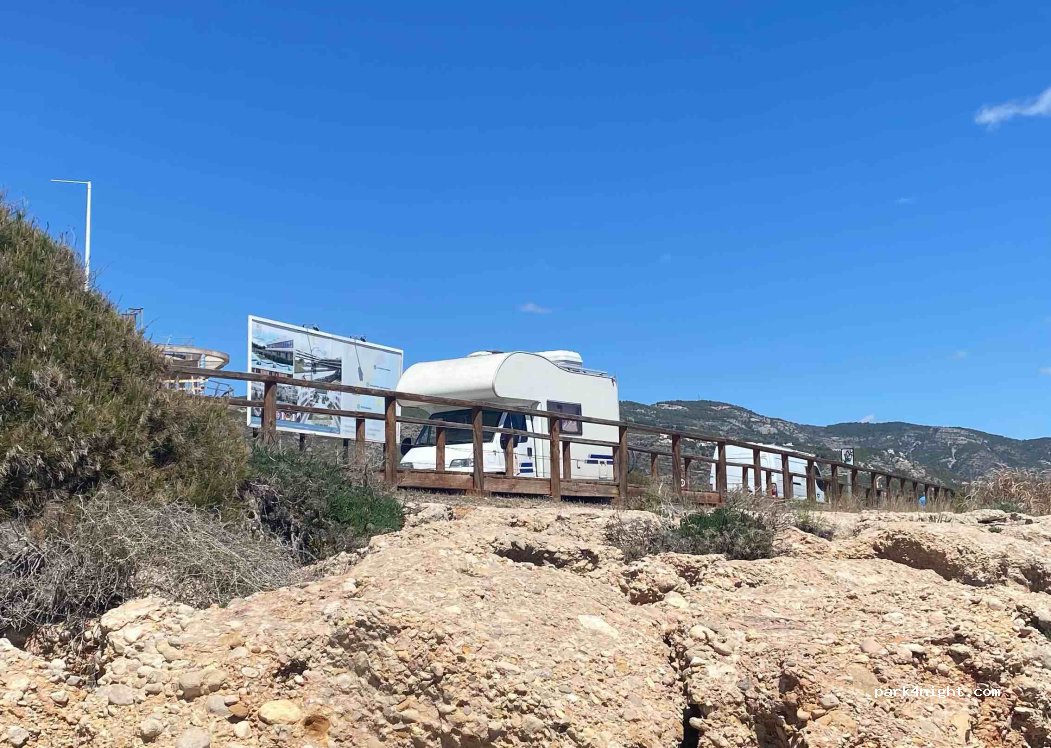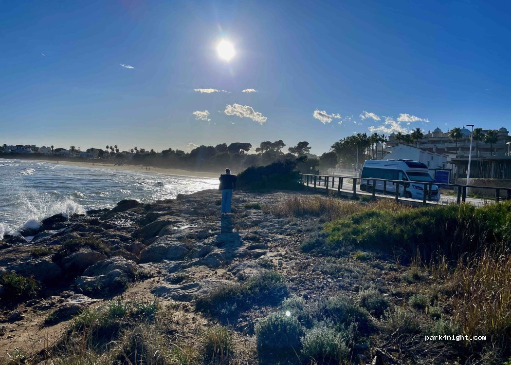 Parken am Straßenrand zwischen zwei Buchten. Direkt an der Promenade, Nachts in der Nebensaison sehr ruhig. Mülleimer vorhanden, Restaurants in der Nähe, Duschen und Toiletten am Strand. Polizei kam mehrmals vorbei ohne anzuhalten, keine Verbotsschilder. Straße in der Nacht beleuchtet, haben uns sicher gefühlt und zum Rauschen der Wellen gut geschlafen.