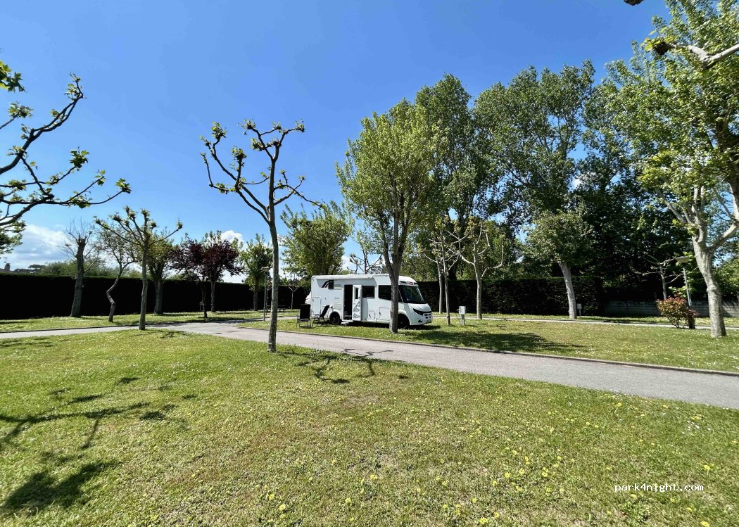 Camp is good and has everything. Modern facilities, lots of trees, pool, market, BBQs. Spots are grassy but a bit narrow to the point it's hard to extend the awning fully and they are not really separated. Enough space even for bigger RVs. Beach easily reachable by bike. Old town a bit further away but manageable. Overall a positive experience.