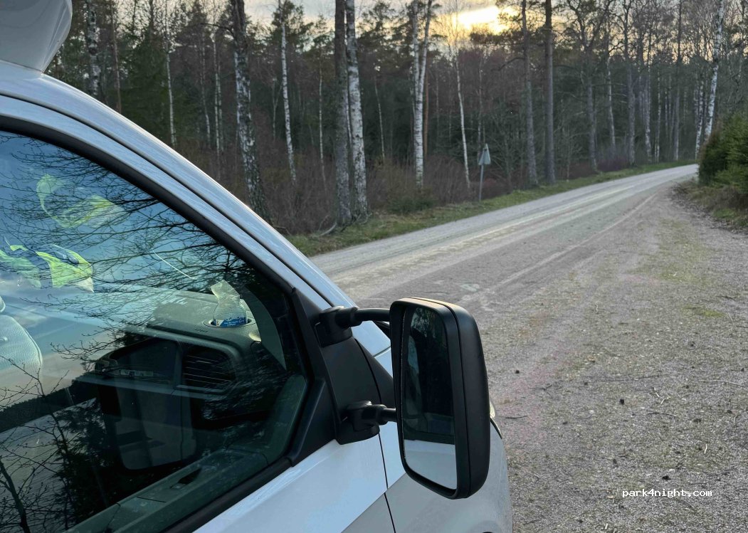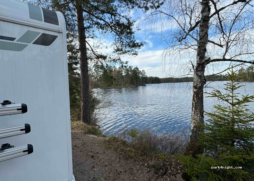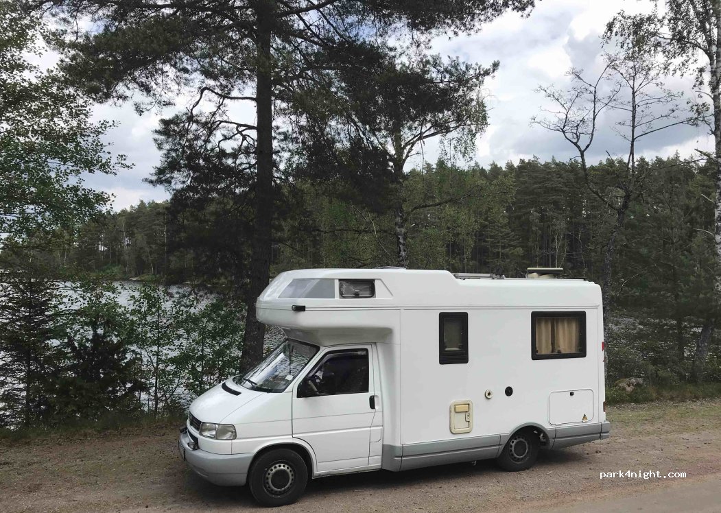 Small, cozy parking bay surrounded by two lakes and forest. Access is via a partially very narrow gravel/sand track, which is only 3.5m wide at its narrowest point. We really liked the opportunity to swim and there is also a barbecue area in the forest. Quiet location, only now and then a car passes by, otherwise the road is quiet and you can enjoy nature.