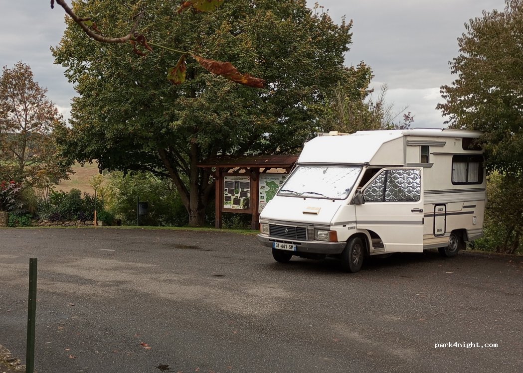 Small village parking lot. Public toilet of the village at 50 m (going towards the town hall on the right). Calm at night but awakened by the church bell at 9am with a small sonata! Very cute village!