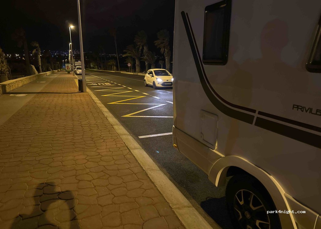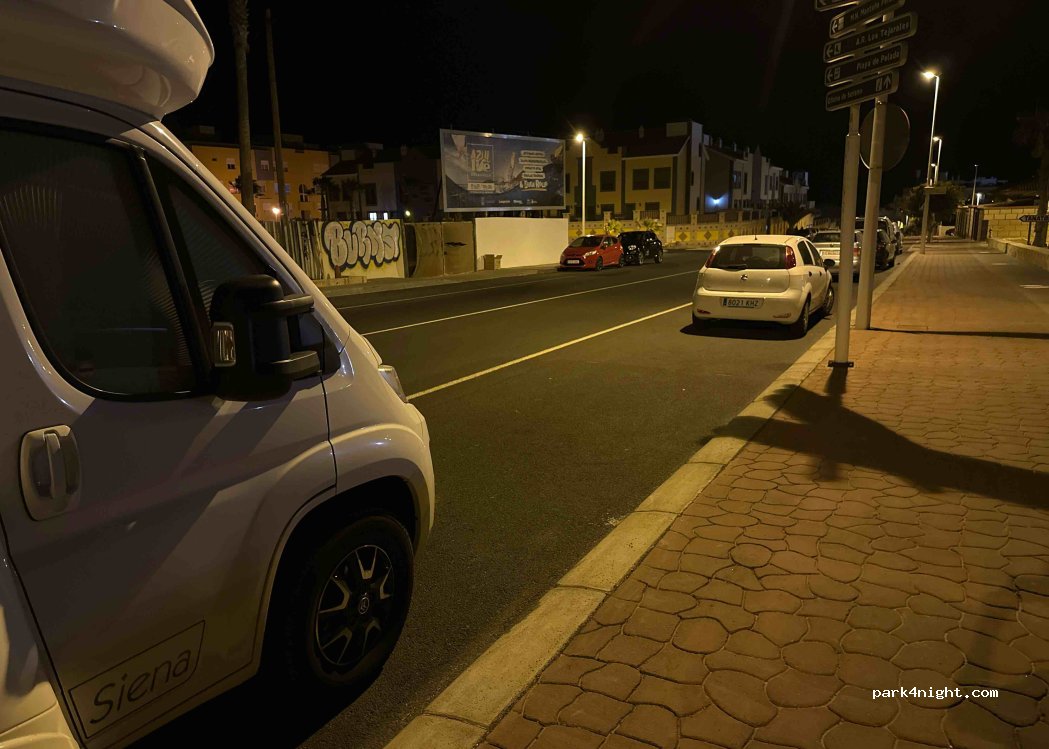 Wide parking on the sides of the road. Possibly the best place near El Médano since all parking spaces within the city are either tight for a motorhome or strictly prohibited for motorhomes and caravans. The bad thing about this place is the road noise and exposure to side wind. Easy access to El Médano via passable sidewalk.