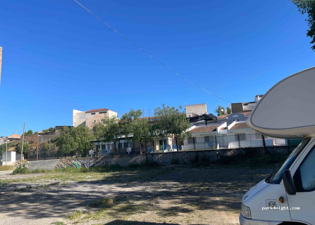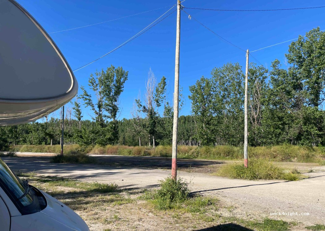 Explanada, al lado de las pistas deportivas, muy plana, de arena entre un arbolado de chopos, tranquilidad para dormir pasar el dia al lado del pueblo.