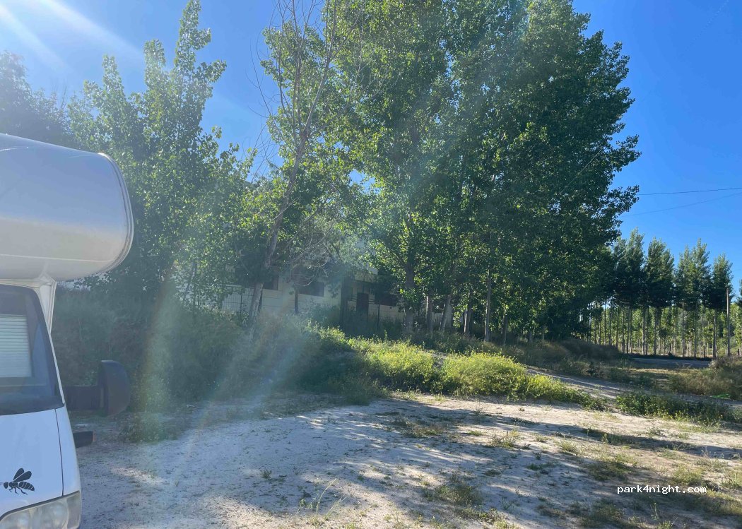 Esplanade, next to the sports courts, very flat, sandy among a poplar tree, quiet to sleep and spend the day next to the town.