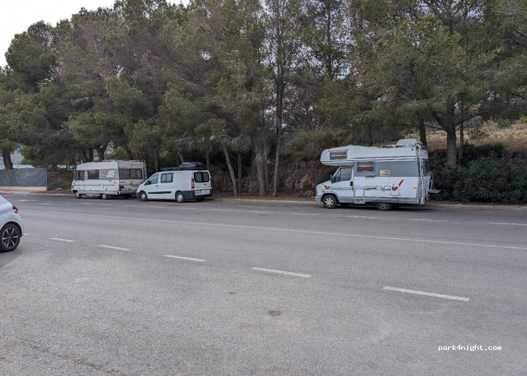 Parking spacieux et gratuit le long d'une route principale de Palmanova. déjà connu des campeurs libres comme vous pouvez le voir sur la photo. Un supermarché et un centre sportif sont directement là.