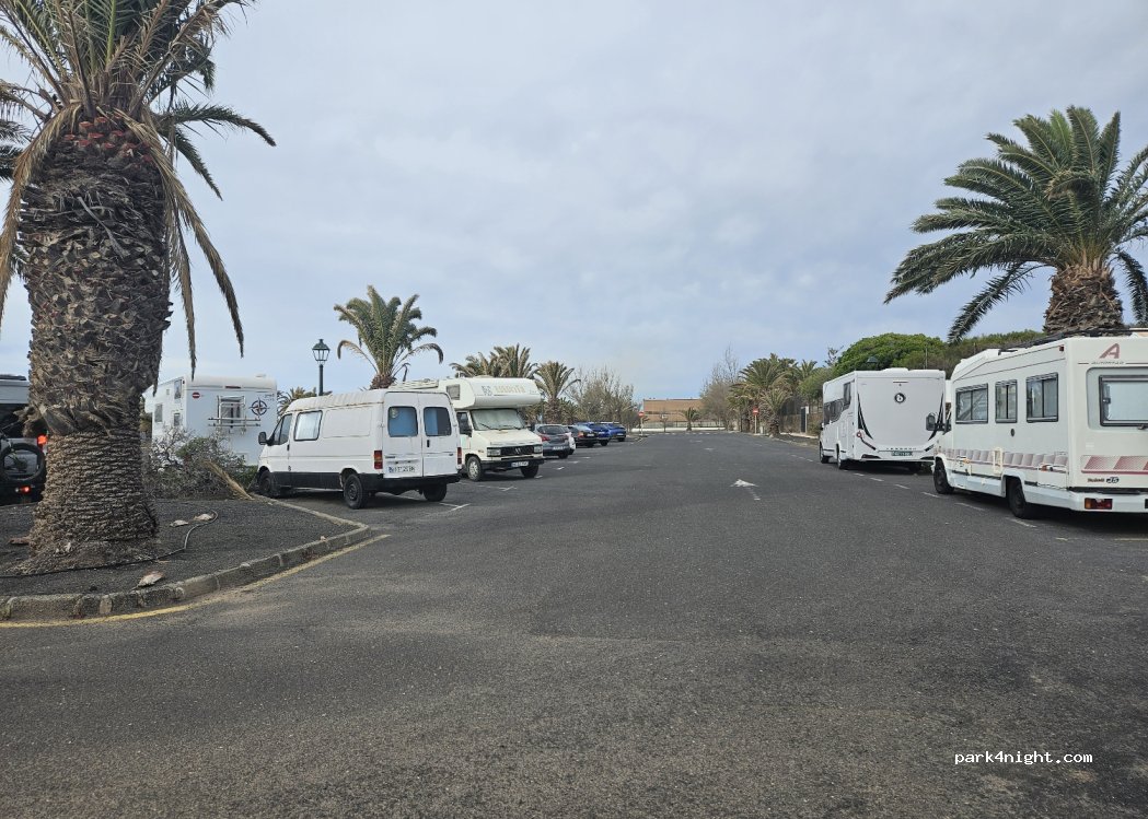 Grand parking à proximité du centre. Commerces, restaurants et laverie à 5 minutes. Le long de la route, mais sans être gênant. Le parking étant vaste, il est possible de se garer loin de la route pour plus de tranquillité. Un peu d'espace en longueur est prévu pour les gros véhicules. Les emplacements en épi permettent de garer un véhicule de 7 personnes. Le lieu est joliment paysagé avec des palmiers. Nous avons passé une très agréable nuit.