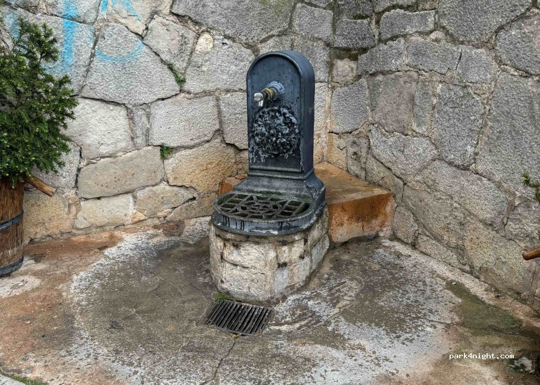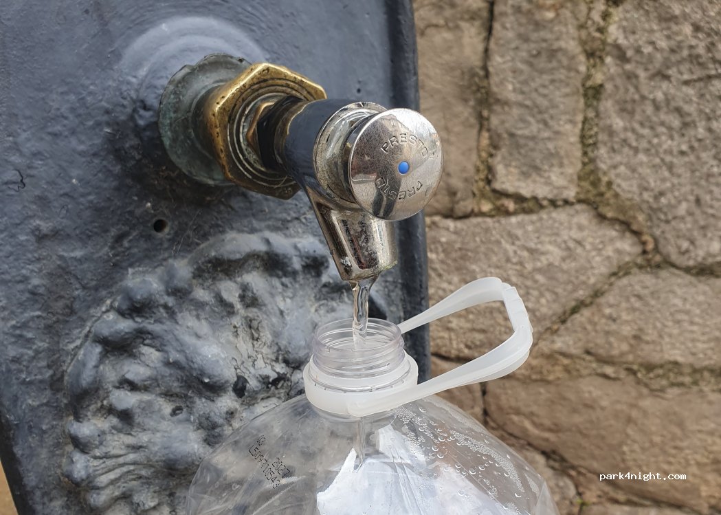 Eine Flasche kann man hier auffüllen, einen Kanister eher nicht. Wasser riecht nach Chlor, würde ich nicht trinken