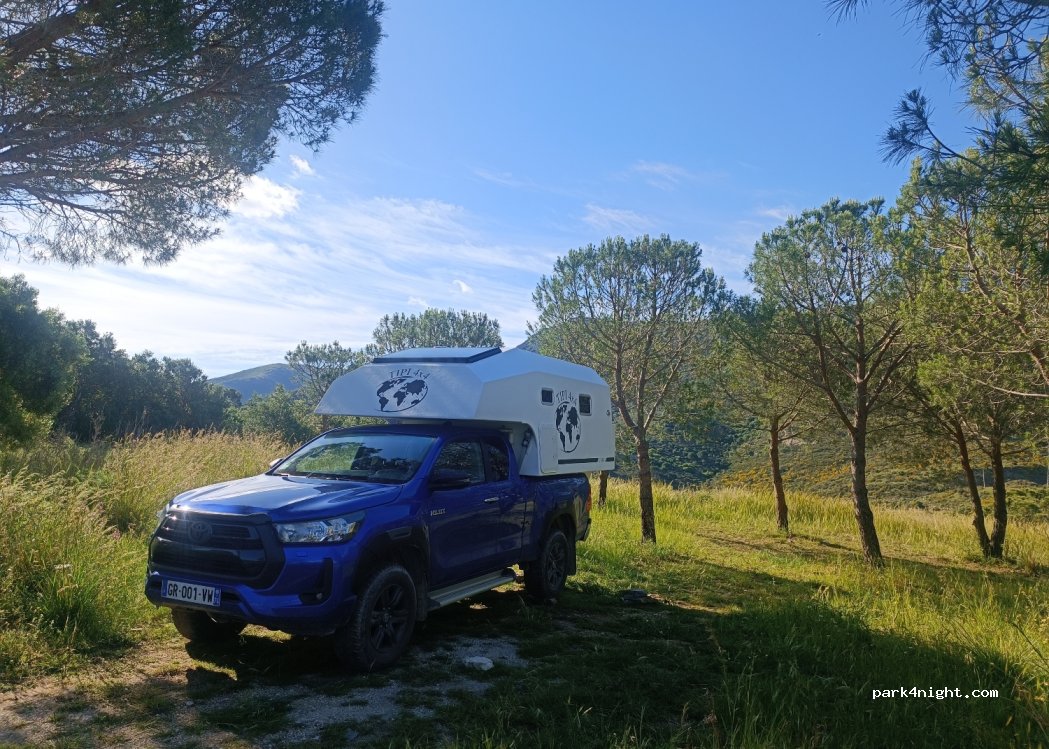 Au dessus du grand espace du précèdent spot, petite place entre de jeunes pins. un peu plus isolé. toujours le bruit de l'usine mais avec un véhicule bien isolé on ne l'a as entendu de la nuit.