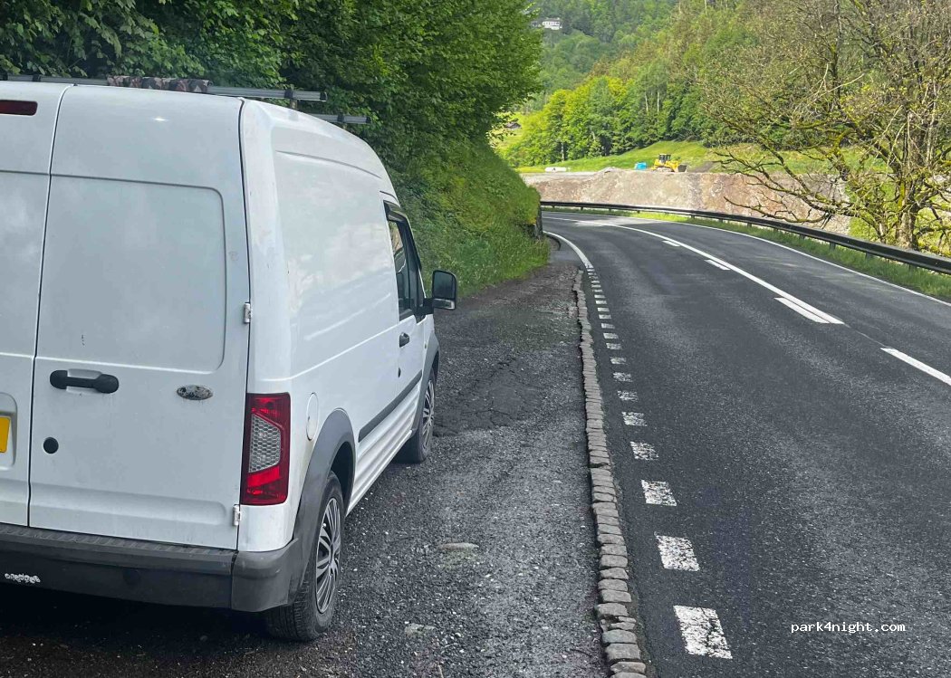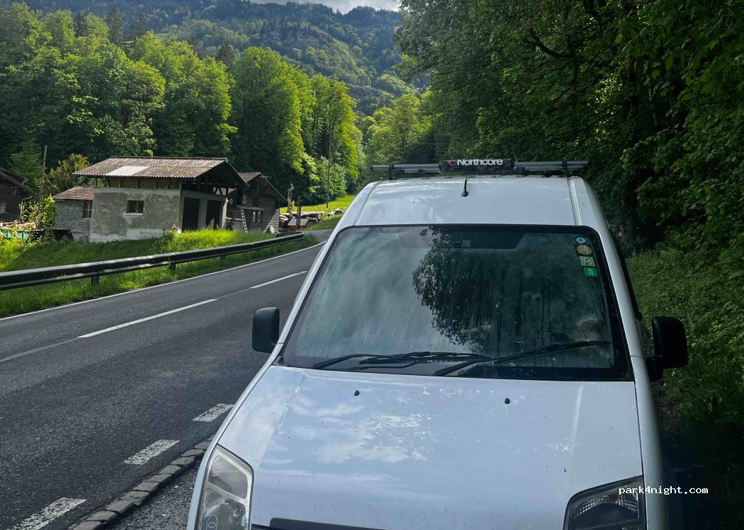 Decent sized lay-by just before the road up to Rosenlaui (there is a camping ban all up that road). Slightly sloping and a lot of road noise until late, however it is free and we had no issues