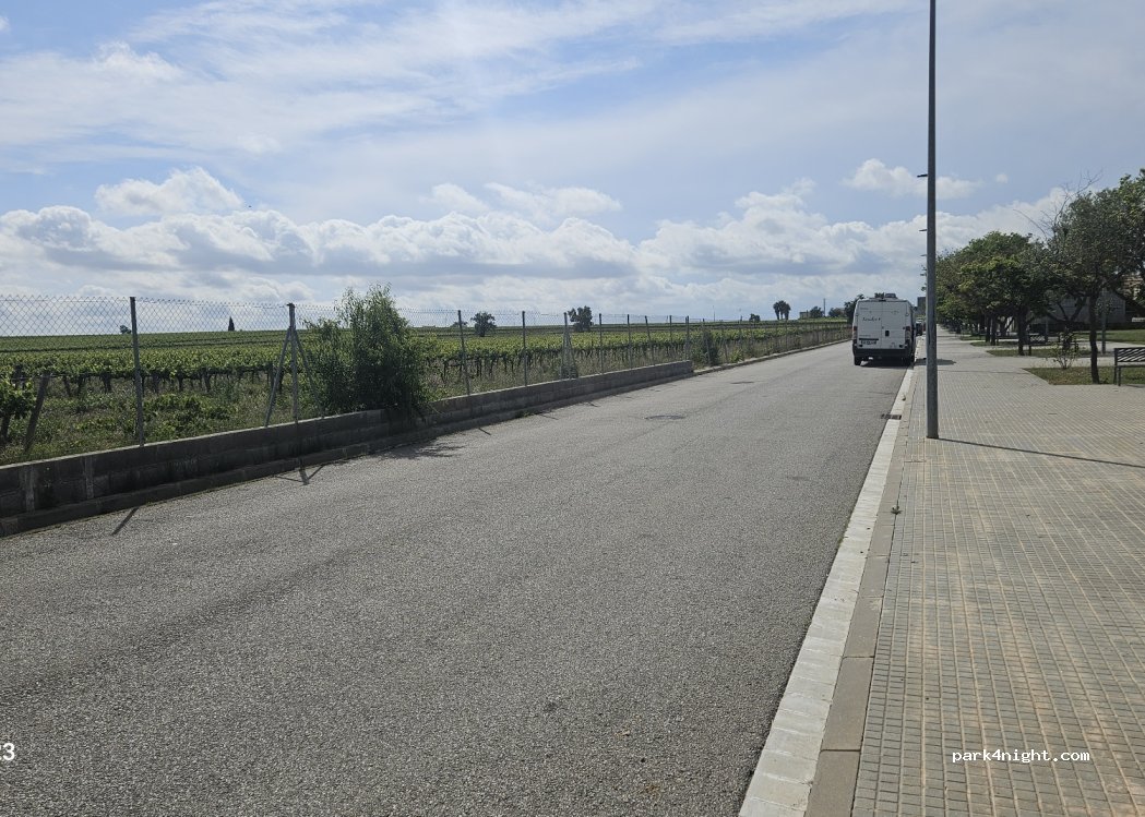 Al borde de un camino muy transitado rodeado de viñedos y un gran césped, bancos y cubo de basura, muy tranquilo, sin prohibición, ideal para pasar el día y visitar el pueblo de al lado, y también perfecto para una noche relajante.