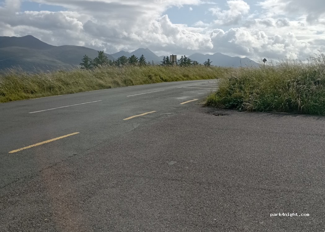 No overnight parking sign. although when I arrived there was 2 other campers there so I took the chance. Good quiet spot in a rural location right beside the hotel. Meant to have a great view but I couldn't see it due to weather! Would stay again.