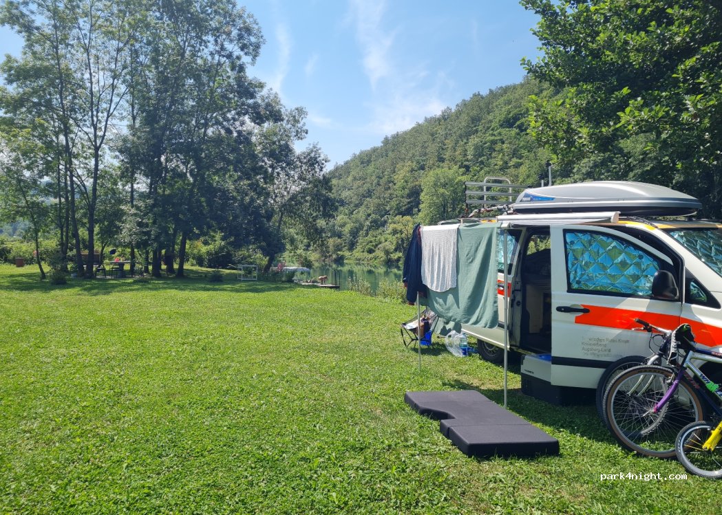 herrlich gelegener Platz an der Una. Man steht direkt am Fluss und kann vom Steg wunderbar reinspringen. Wir waren zusammen mit 10 Campern dort und da ist 1 WC, 1 Dusche und 1 Waschbecken schon sehr wenig. Es ist keine Spülmöglichkeit vorhanden. 10 € für 2 Personen mit Jeep und Dachzelt hat dann ein sehr gutes Licht auf diese Platz geworfen. Es ist also noch etwas Luft nach oben.