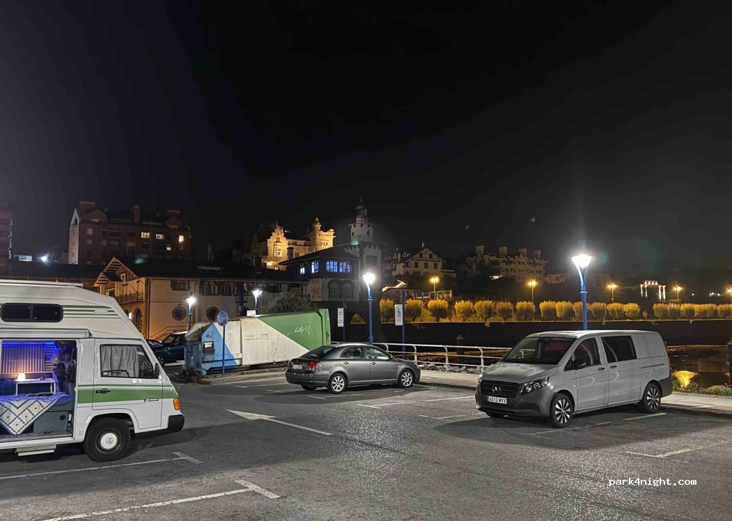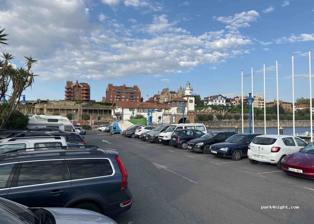 Nous avons réussi à nous garer face à la vue ! le top. Nous avons eu peur car aucun CC mais je pense que les gens n'osent pas. vous pouvez vous garer au fond (vers l'embarcadère Bilboats) ou le long de la digue si votre CC est vraiment trop long pour entrer dans les places ! un peu loin que l'aire officielle des CC mais de places et proche de la plage (sans charme). métro à 7mn de marche