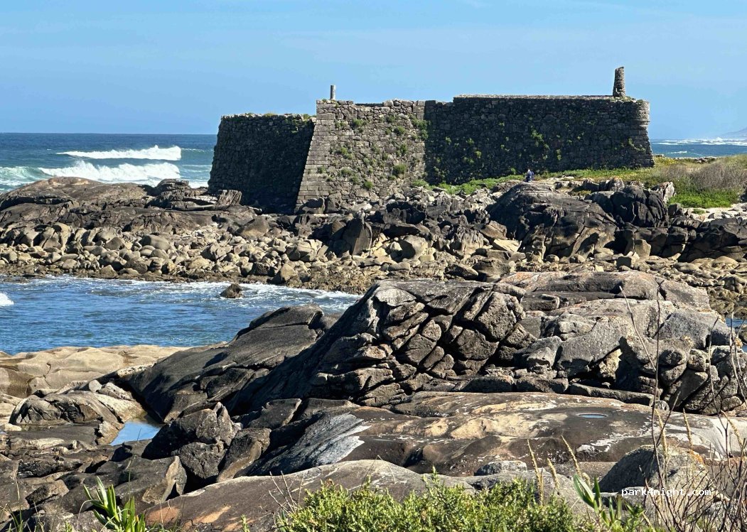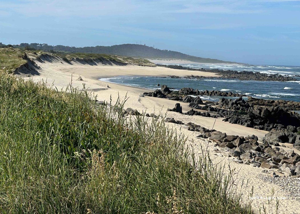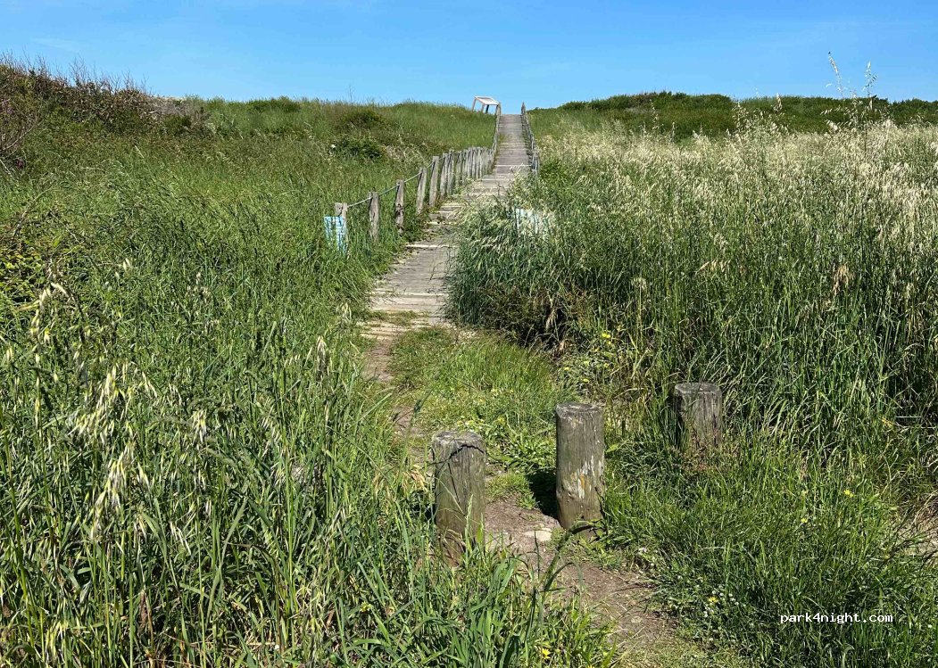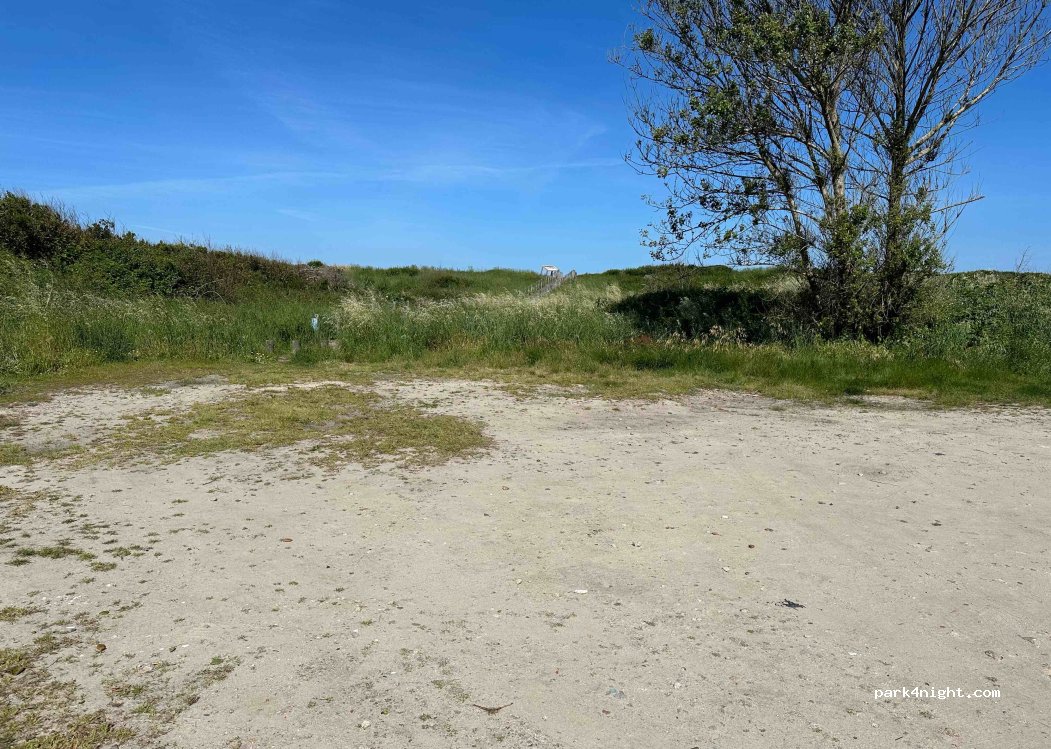 Kleiner Parkplatz direkthinter der Düne mit Holzweg direkt zum Strand. Sand und Felsen zum Schwimmen nicht geeignet aber landschaftlich sehr schön . Über Fußweg entlang der Kiste in ca 500 m kleines Fort( Ruine) weitere 200 m Restaurant. War aber nur mittags geöffnet . Platz sehr ruhig Fels.