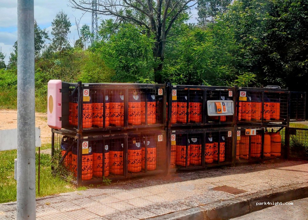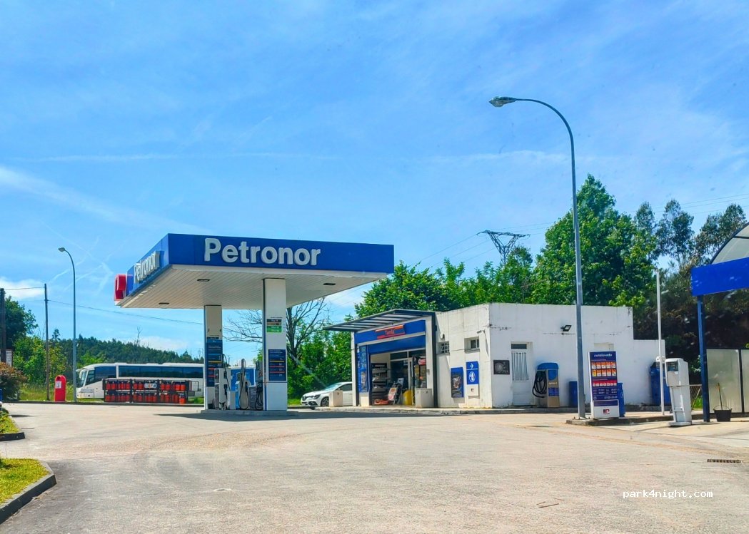 Tankstelle an der PO-415 mit: einem Laden, einer Gasverkaufsstelle (mit Butan- und Propangasflaschen), einer Waschstelle und einer Müllgarage.