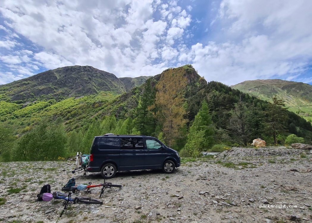 Large flat parking area in a beautiful valley. It is 3km on a very narrow single track road. Beyond this spot overnight parking is not allowed, but here is still very beautiful, next to a lovely river.
