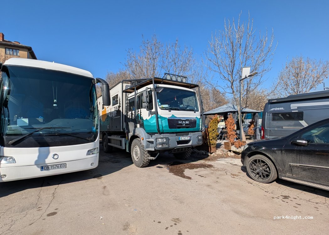Parking pour tous types de véhicules , 15 euros ou 30 lev bulgare ! Le gardien Zarco fera le maximum pour vous , eaux et électricité ( peut-être pas assez de prise ) premier arrivé premier servi ! Wc chimique ! Ok ! Centre ville à 20 mn à pied . Je voulais remercier le gardien encore une fois ! Merci Zarco