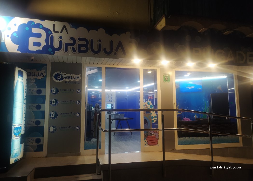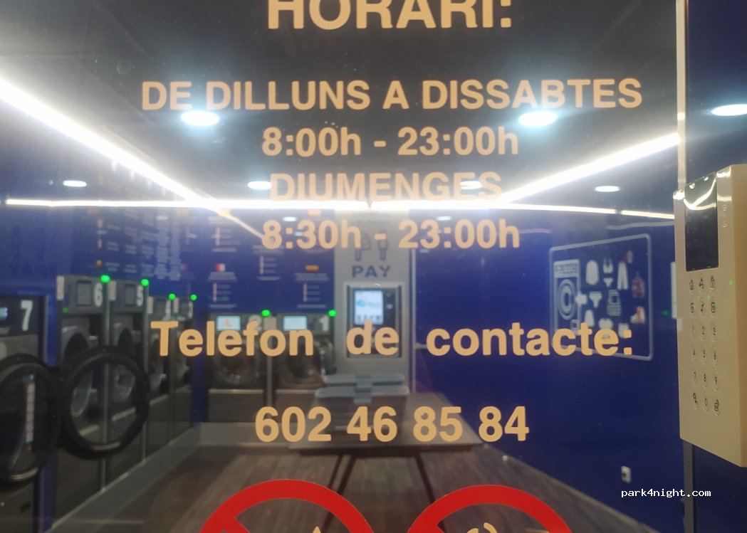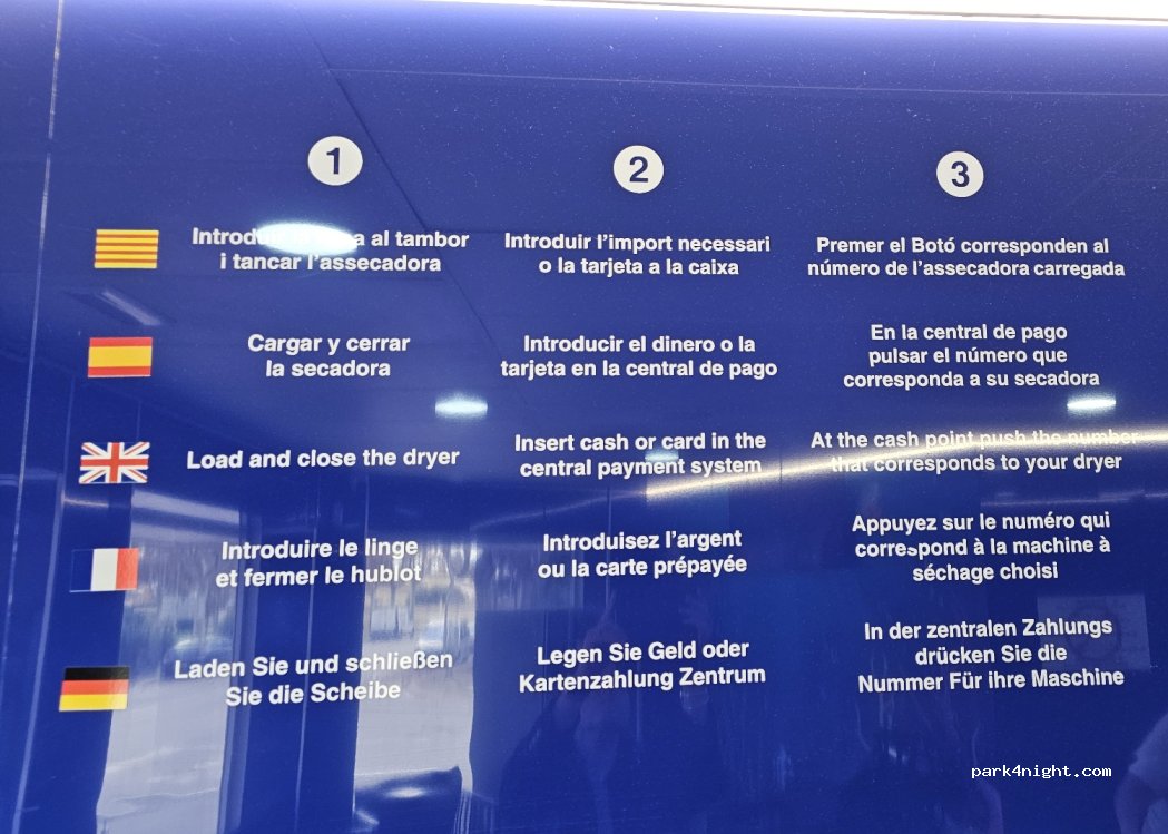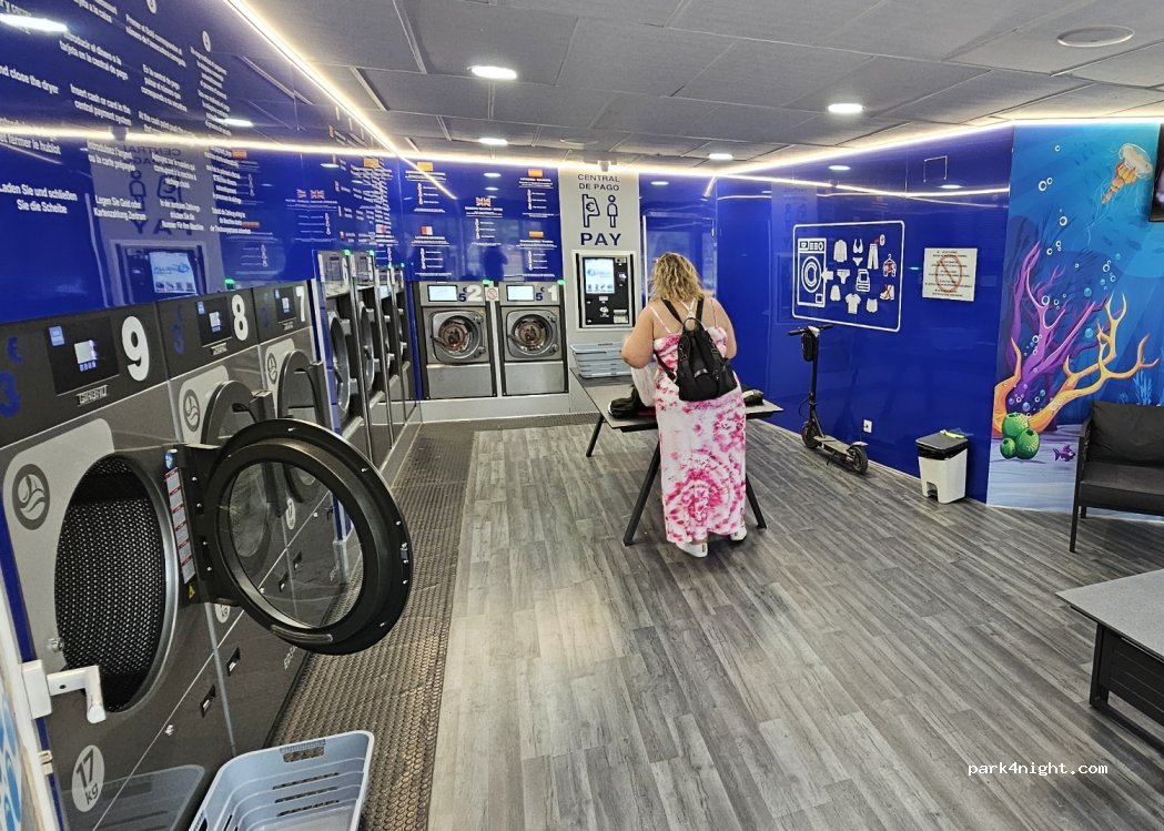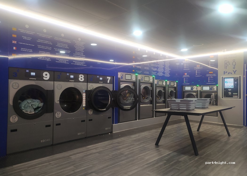 Lavadero muy nuevo, con lavadoras de 2x9kg, 2 lavadoras de 13kg, 2 lavadoras de 18kg y secadoras de 3x17kg. La calle es ancha y de doble sentido y hay un parque gigante. Estamos a principios de junio y la autocaravana se puede aparcar muy bien en el exterior.