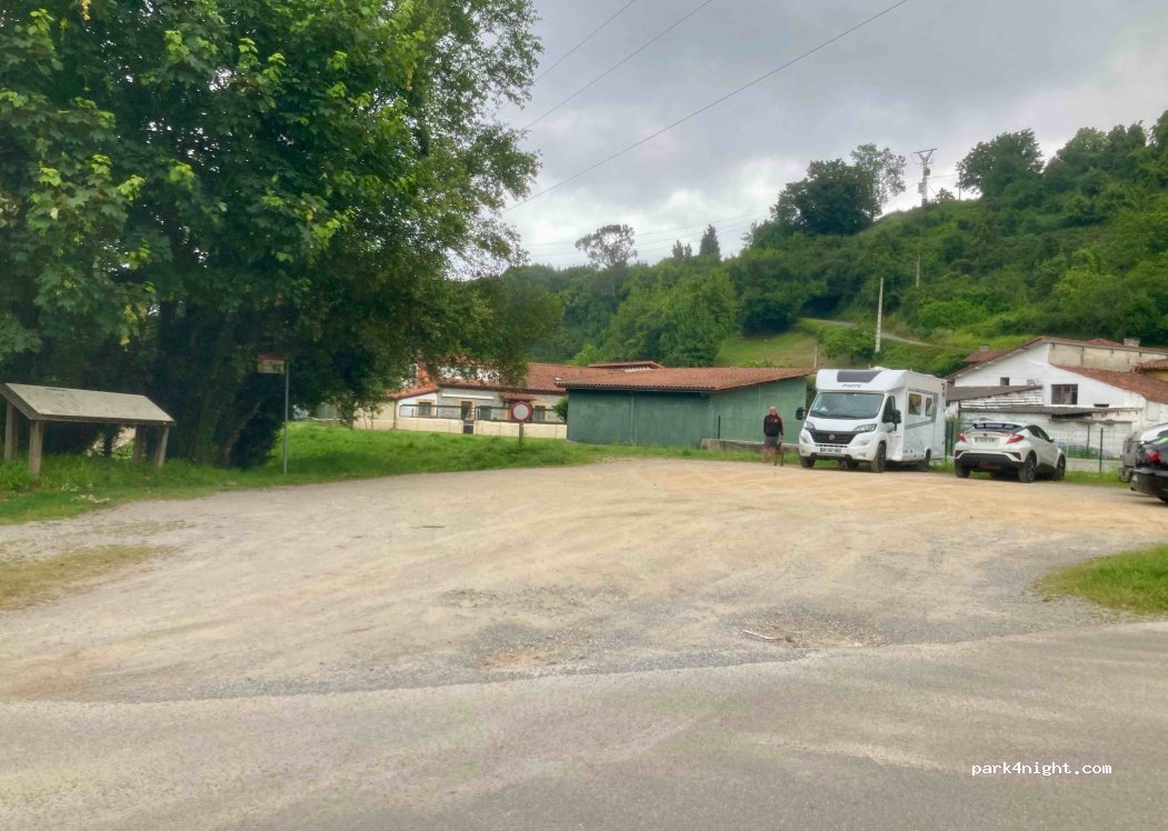 Pequeño aparcamiento estable en la parte trasera, tranquilo, a dos pasos de un gran parque arbolado. Genial para dar un paseo por el parque y dejar que los perros jueguen en el césped. Sale desde ahí una ruta fluvial hasta la camocha, con río para refrescar a los peludos. Está permitida la pernocta.