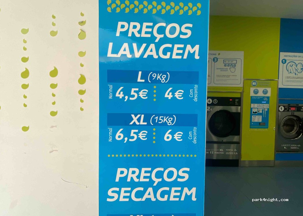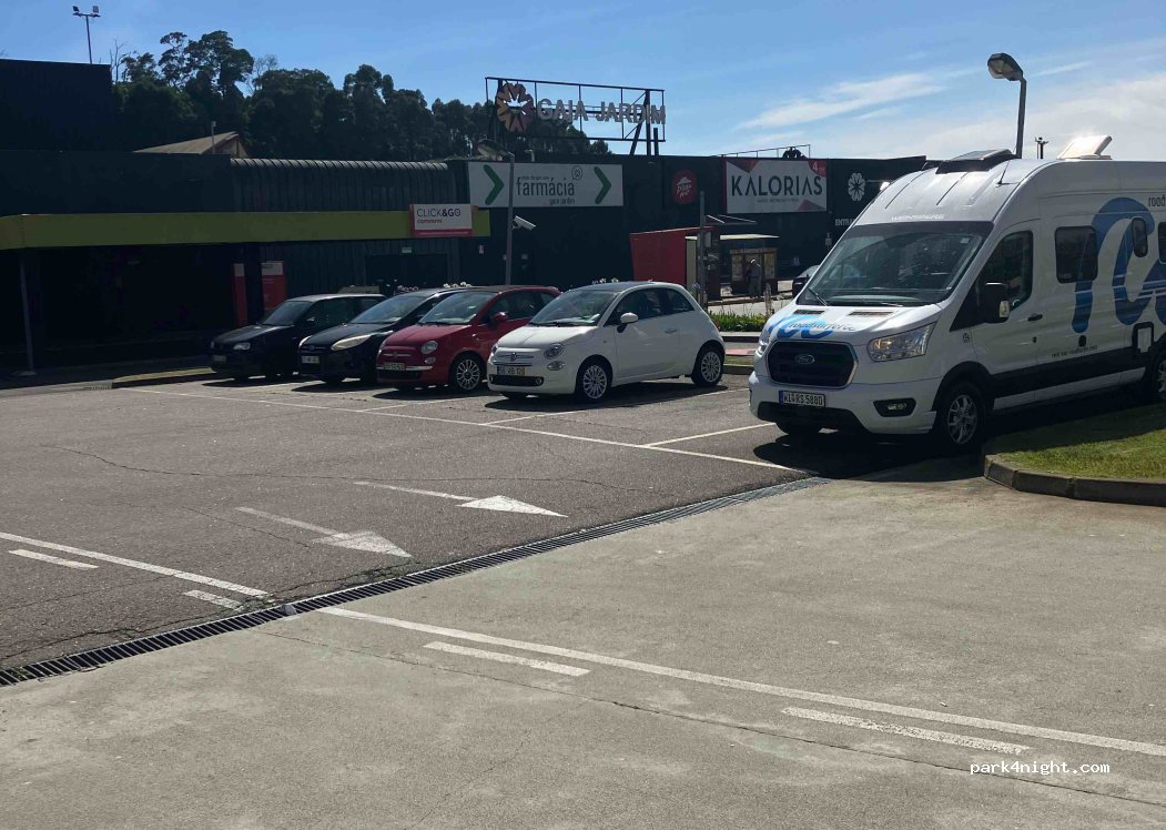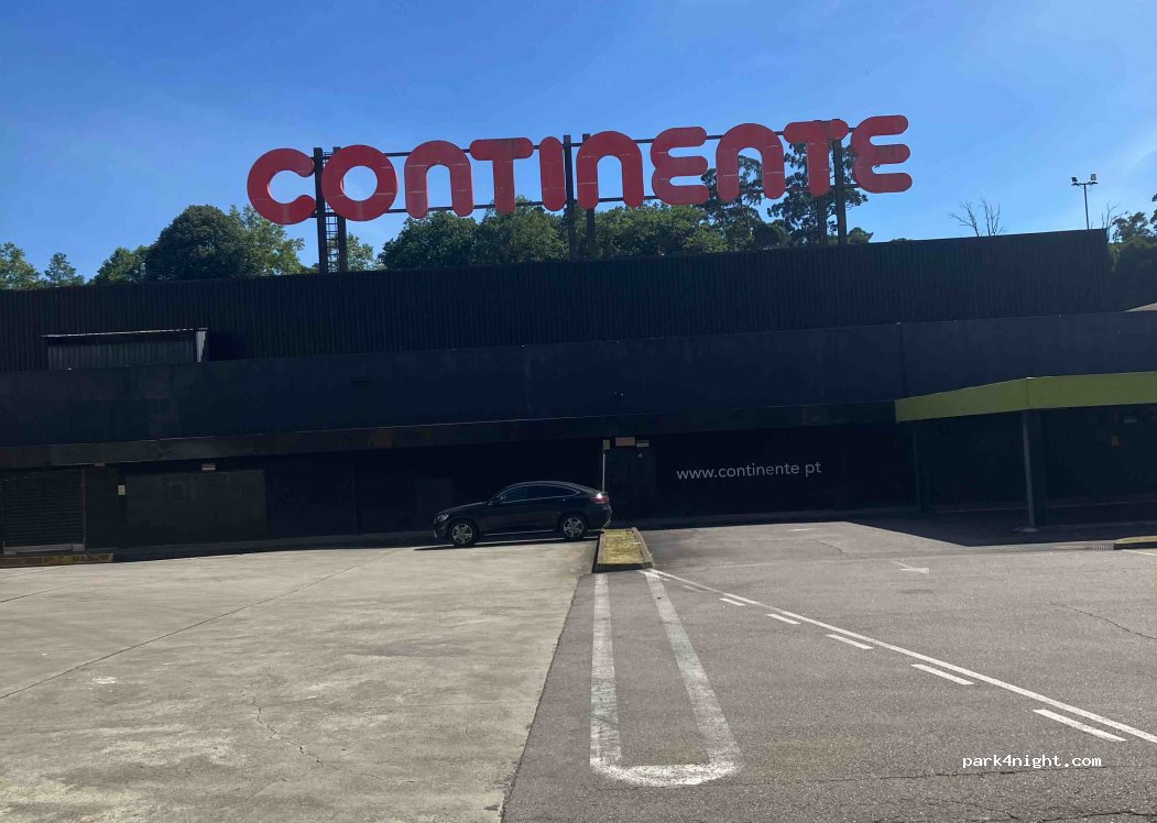 Continente parking lot. Main parking area limited to 2.6m but 6 bays near entrance open to all heights. Large supermarket, laundry, public toilets, gym, cafes, chemist. Handy to city. €4-€10 for Bolt transport.