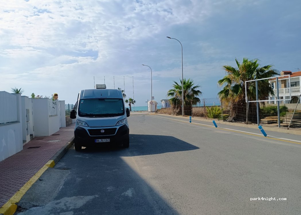 We have slept here. On the way down to the beach there is a portable public bathroom, beach shower and trash can. In the nearby square there is access to water. There is a free caravan parking lot 6 blocks away to unload water.