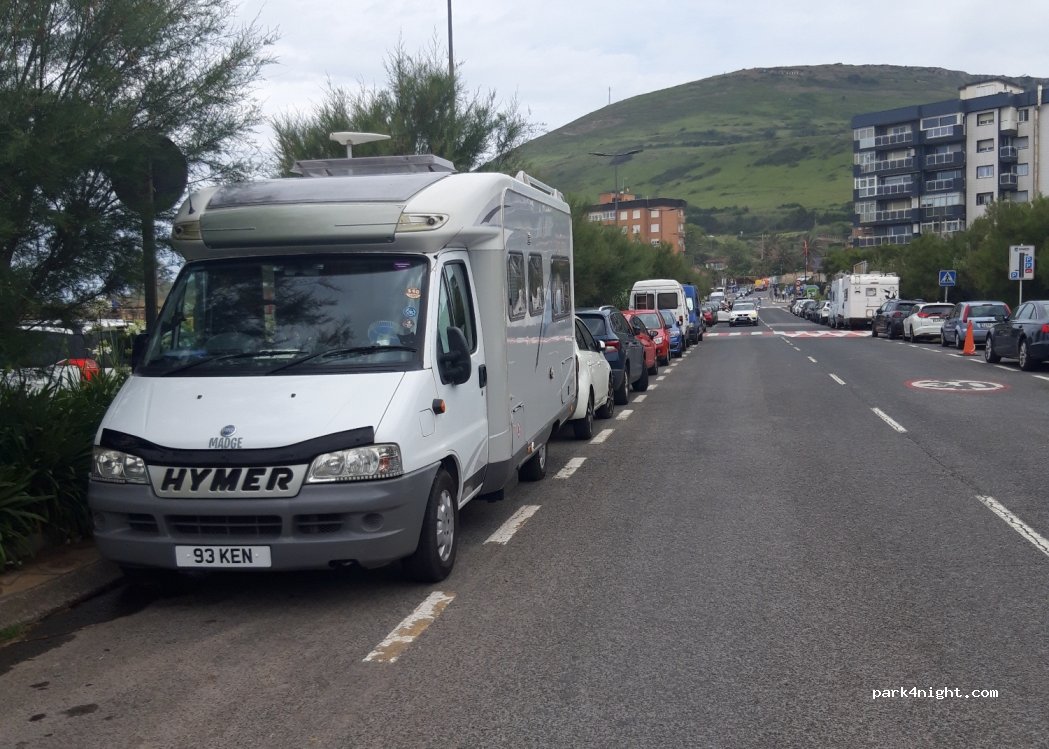 Parking dans la rue de chaque côté de la route principale mais calme la nuit. nous avons très bien dormi, bien éclairés et en sécurité. eau potable à côté des bus, beaucoup de bars et restaurants petit supermarché. très belles balades, très proche de la plage.