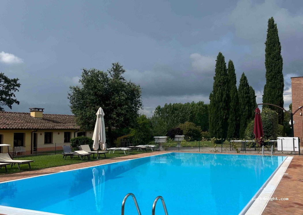 Parcheggio gratuito presso la struttura per vacanze con piscina. Carico e scarico; corrente gratuita presso la casetta con le lavatrici. Se volete potete cenare presso il ristorante.