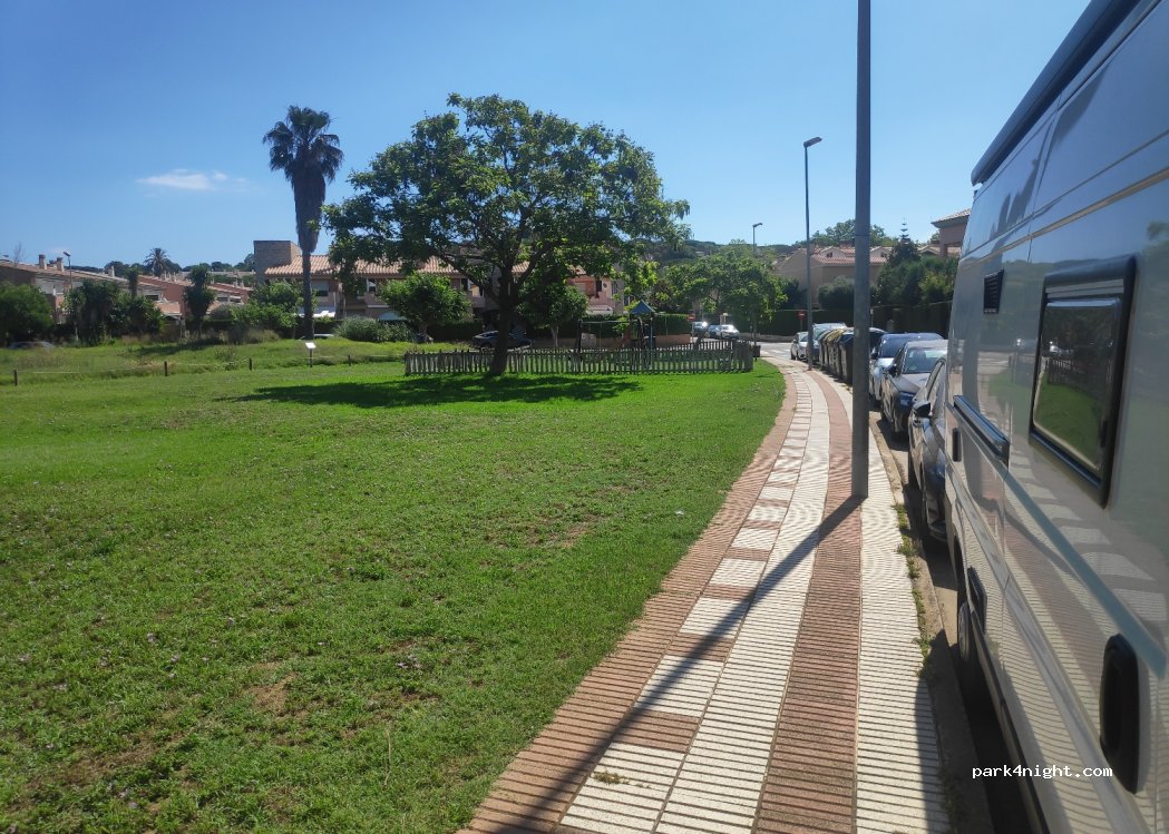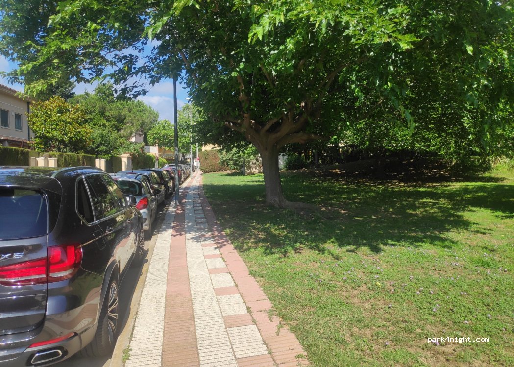 Zona residencial donde poder aparcar gratis fuera de la zona azul. Calle tranquila con jardin, columpios y basuras.