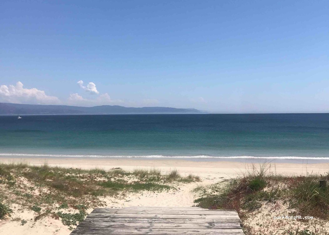 Small level parking lot shared with passenger cars, with a short view of the pretty white sand beach. Beach shower nearby. There is a bakery 100 m away and beach bars where you can have a beer or eat, also a pharmacy nearby. You can walk to the town of Finisterre along the path parallel to the beach.