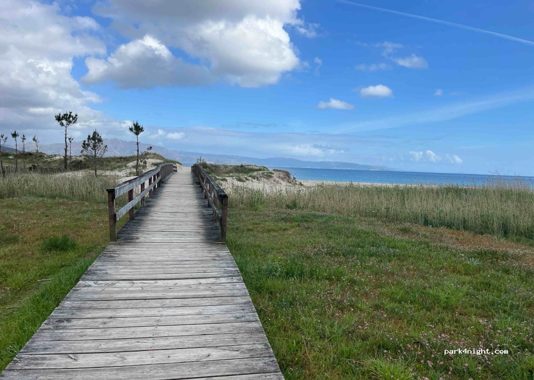 Sitio ideal para aparcar detrás de las dunas de la playa, protegido del viento. Hay un paseo para recorrer de punta a punta la playa, pasan los lugareños y peregrinos. El aparcamiento es completamente plano y muy tranquilo. Por la parte trasera hay bares y restaurantes, también hay una farmacia. Se puede ir caminando hacia el centro del pueblo. Hay duchas de playa junto al parking. Recomendable.