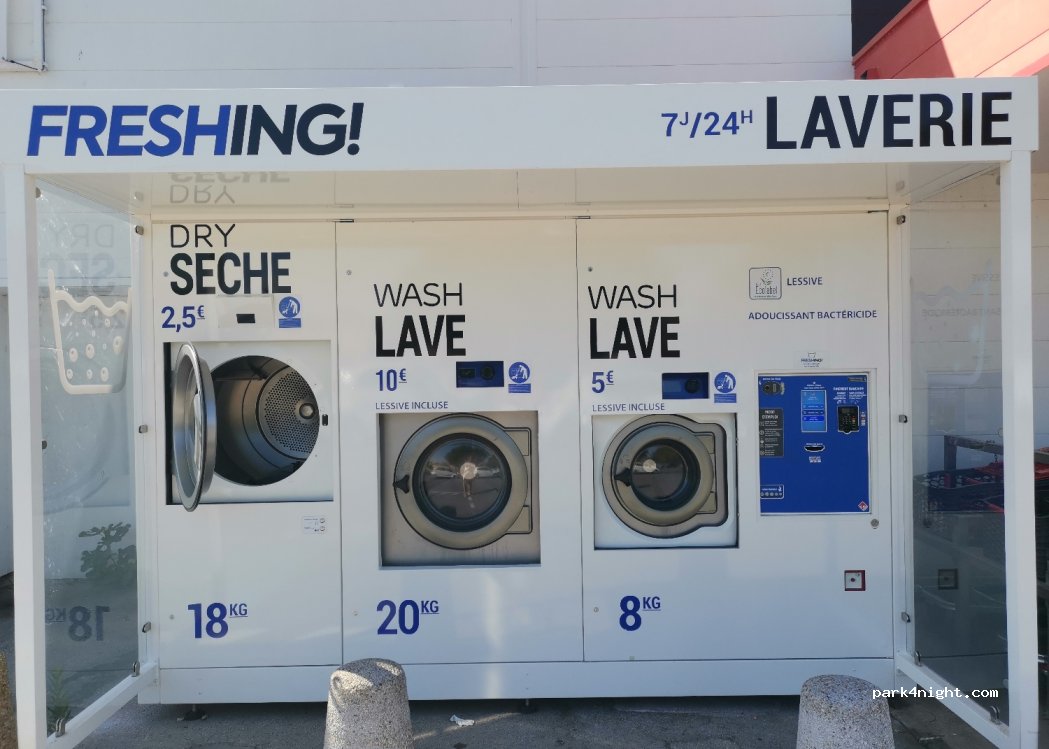 Laundromat in the Carrefour Market parking lot. Depot Mondial relay 24/7. Gas station.