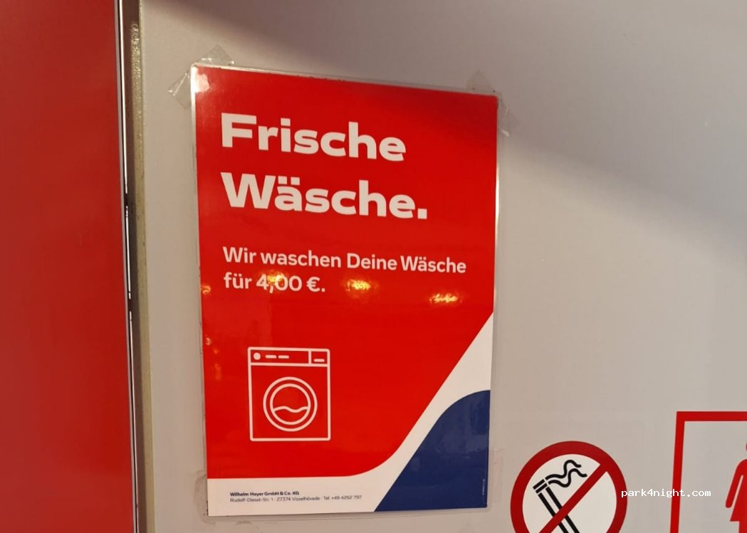 Hoyer Autohof Cloppenburger Land gas station. Here was free toilets for customers and possibility to shower for a small fee. Not the best showers but pretty clean and decent for the price. Also ad about laundry possibility, but we didn't test this service