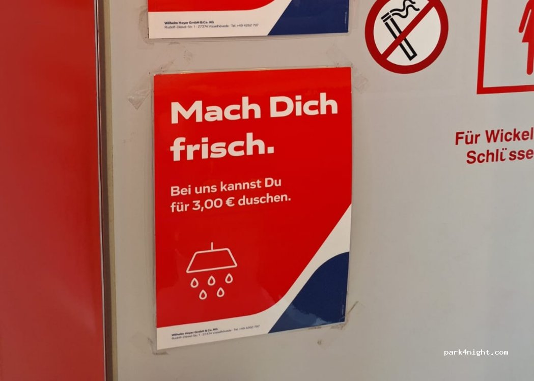 Tankstelle Hoyer Autohof Cloppenburger Land. Hier gab es kostenlose Toiletten für Kunden und die Möglichkeit, gegen eine geringe Gebühr zu duschen. Nicht die besten Duschen, aber ziemlich sauber und für den Preis in Ordnung. Es wurde auch über die Möglichkeit einer Wäscherei berichtet, aber diesen Service haben wir nicht getestet.