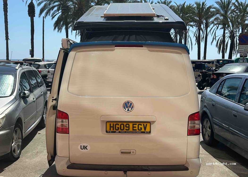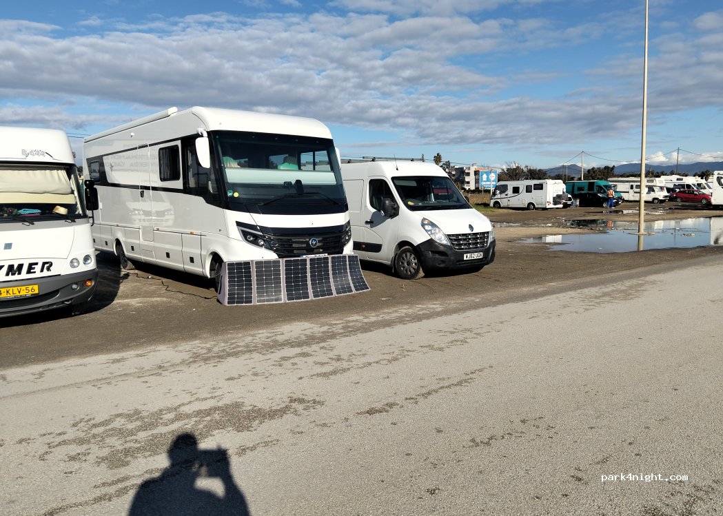 Aparcamiento en la calle frente al mar. Hemos estado aquí dos años seguidos sin ningún problema. No hay instalaciones cerca. Solían ser duchas de playa, pero las han cerrado debido a la escasez de agua. Sólo contenedores disponibles. Cerca del paseo marítimo y de todos los comercios. Lo suficientemente tranquilo por la noche. Gran lugar para quedarse.