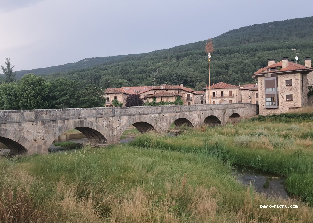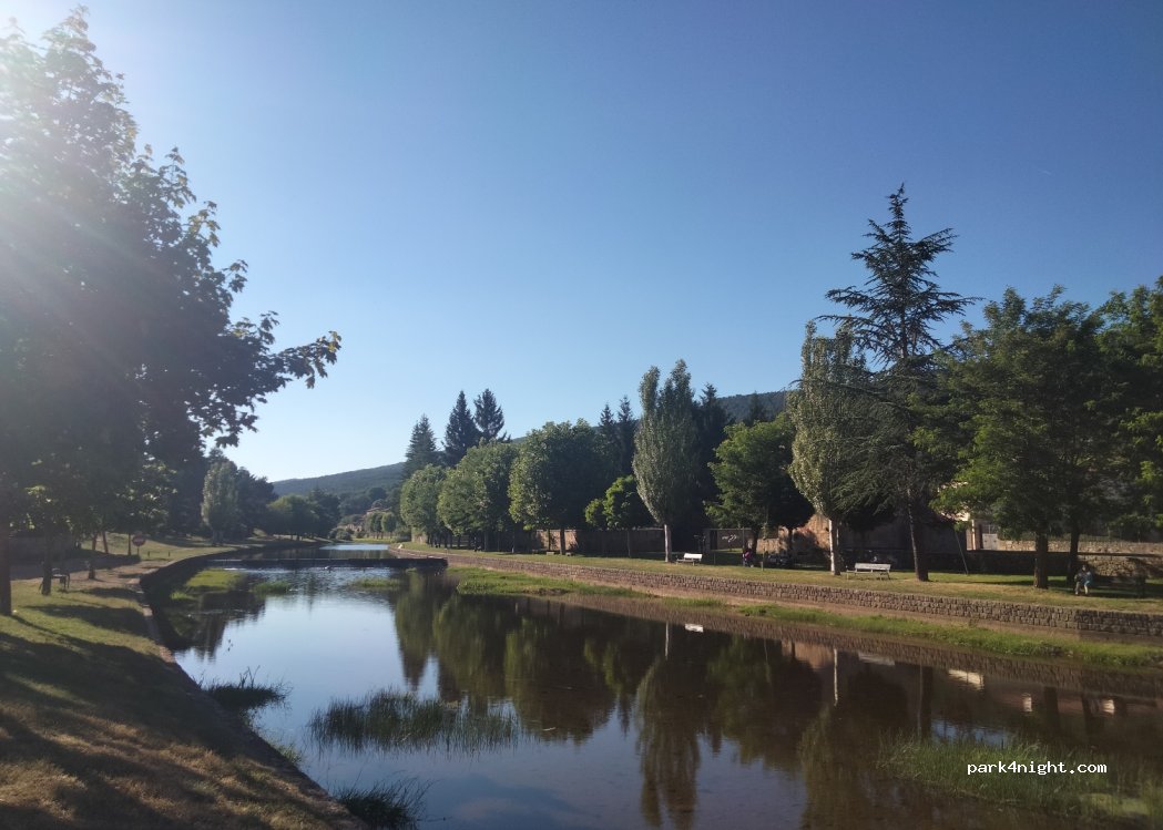 Para acceder desde el pueblo de Salduero hay que cruzar un puente muy estrecho… recomendamos mejor el acceso desde el pueblo de al lado (Molinos del Duero). El lugar es bonito y tranquilo. Había bastantes furgonetas también pasando la noche.
