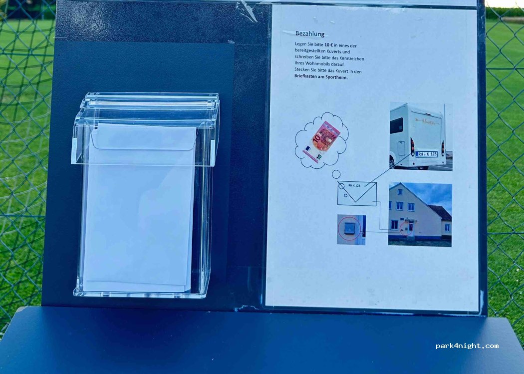 Absolutely quiet place at night and in the morning on the edge of town on a sports field. Playground available. Connection to cycle path network, Rothsee 8 km away. Excellent and inexpensive restaurants on site. On Fridays there is always delicious pizza at the village Greek restaurant. Electricity and drinking water on site. No water disposal. Fee (10 €) is deposited in an envelope in the mailbox at the club building.