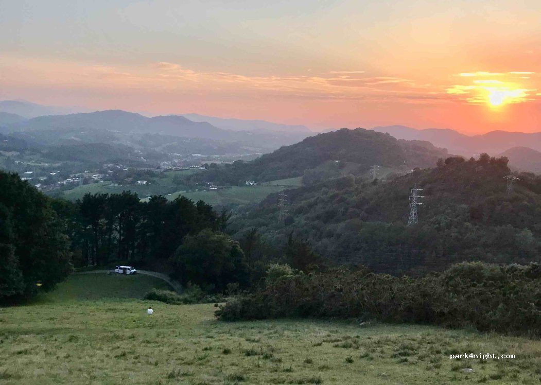 Chemin bétonné non-privé à flanc de colline menant à une ferme. Zone à plat dégagée après quelques centaines de mètres à peine. Vue sur la vallée, lumière magnifique le soir. Moutons et chevaux (!) en liberté. Très calme.