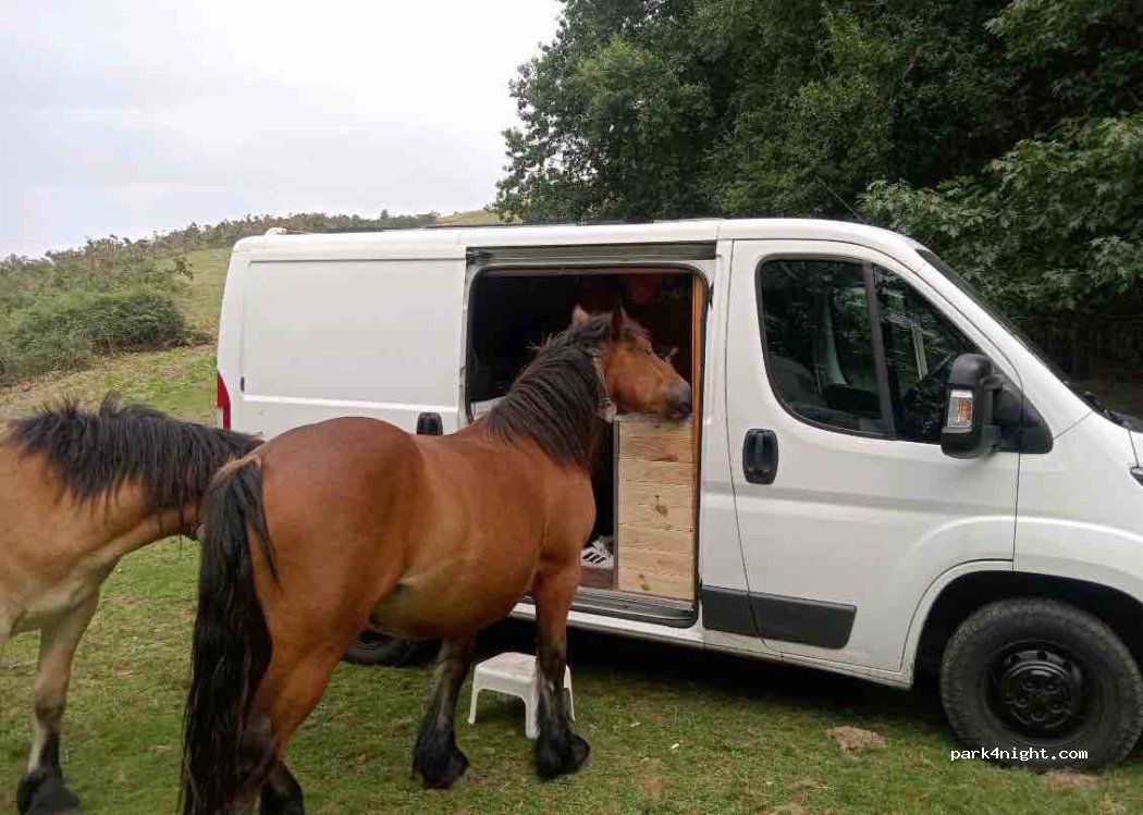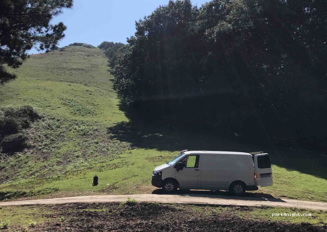 L'accès peut sembler un peu impressionnant au premier abord, mais aucun souci pour un van type Ford Transit ! La vue n’est pas aussi dégagée que depuis les spots un peu plus haut, mais l’avantage ici, c’est qu’on n’est pas en bord de route. Très calme, avec une seule place disponible. Le tas de fumier est toujours là, mais franchement, il ne gêne pas.